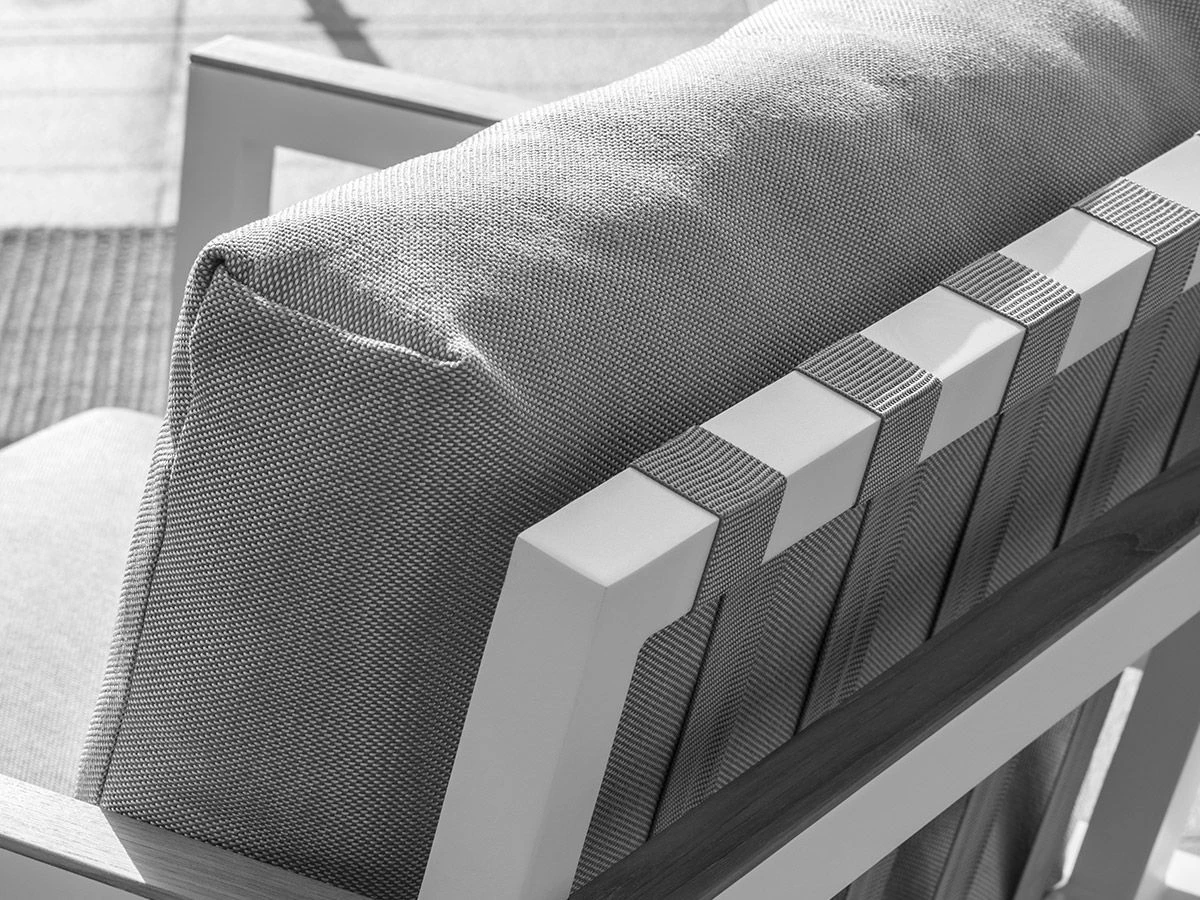 Grey fabric for the white frame; dark grey for the graphite frame. Teak slat along the upper part of the frame (back and arms). Cushions with removable covers, easy to wash and weather resistant. Quick dry foam padding.