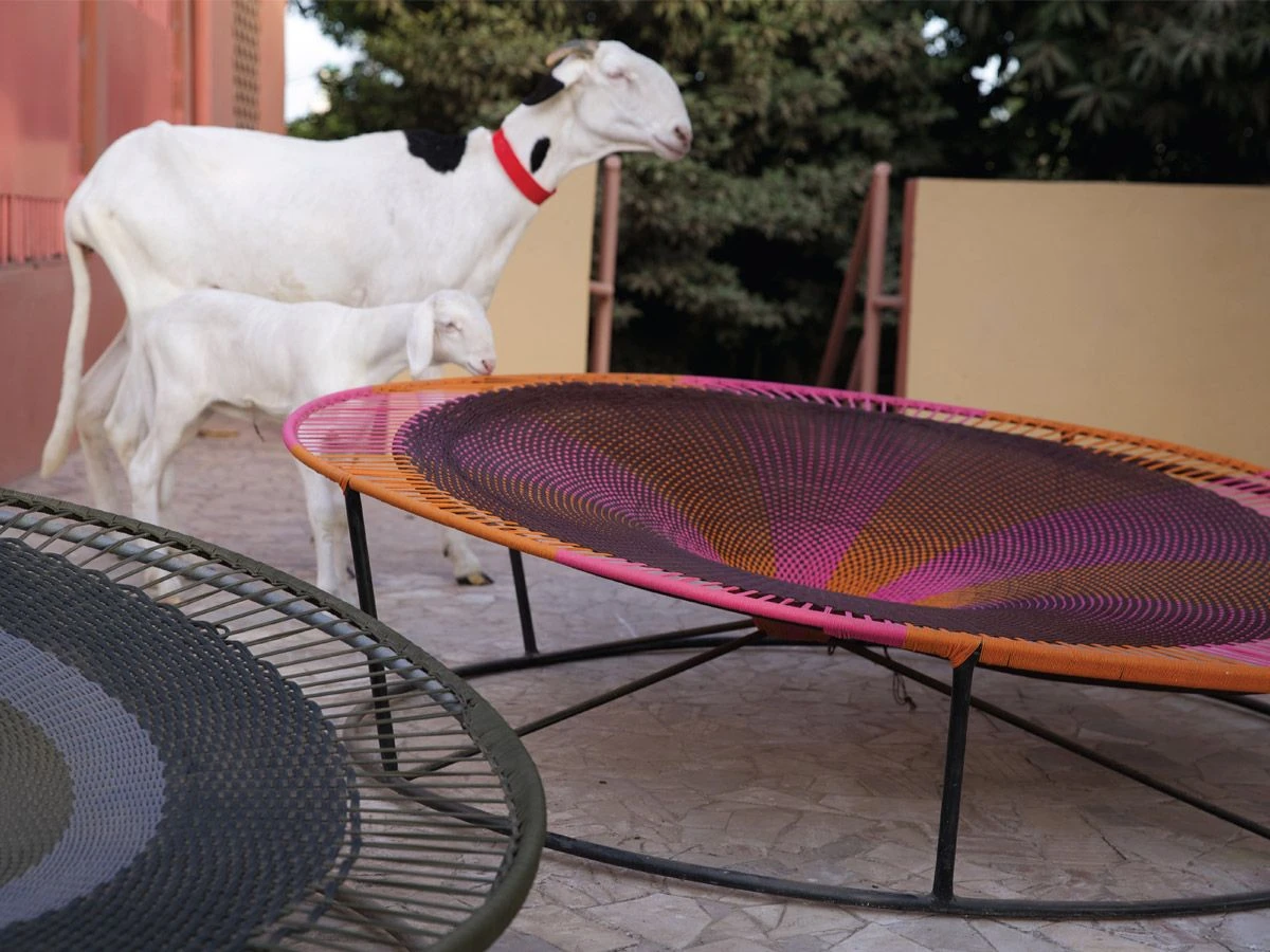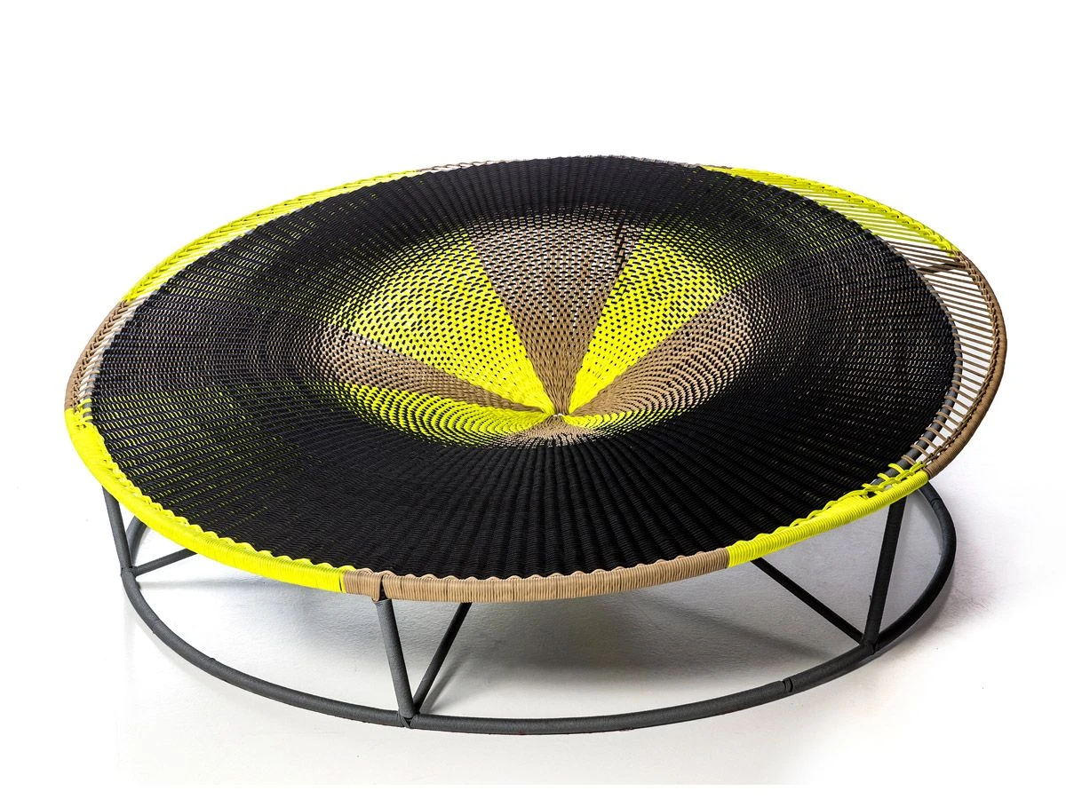 Painted steel frame and hand-woven colored cord. Available in the colored polyethylene thread or in a technical polyester cord. The M’afrique collection is entirely handmade; rich in furnishing components, each piece is unique and the minimal variation of colors, texture and size, characterizes the line, making each piece unrepeatable.