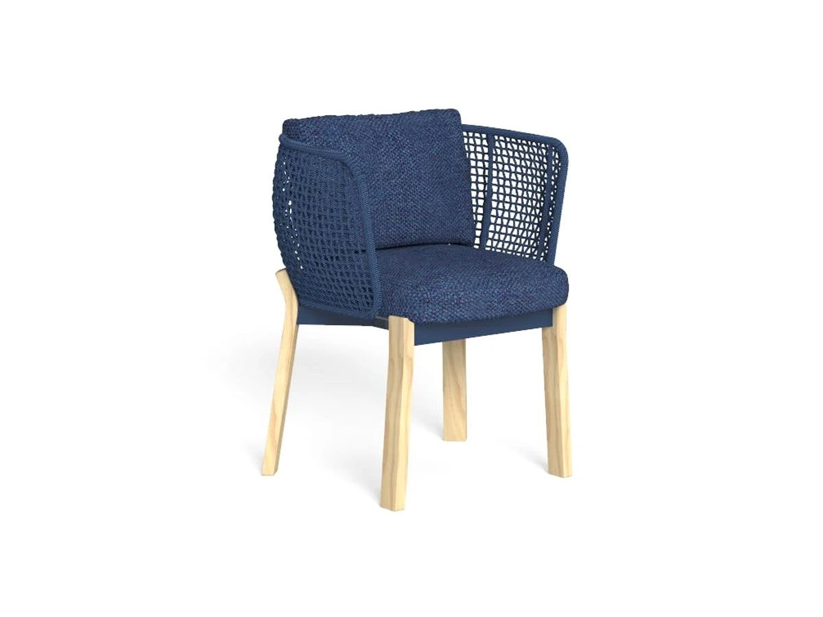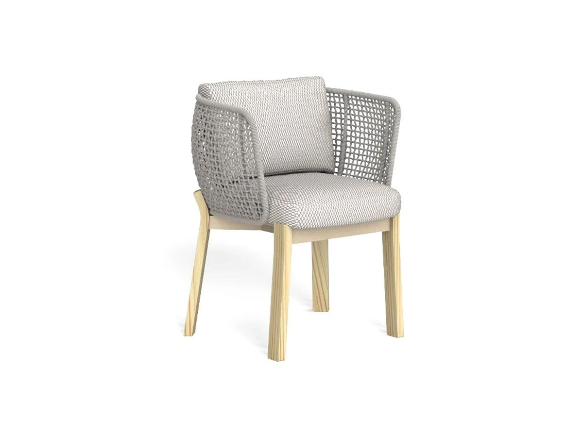Sinuous lines and armrests with geometric shapes for the dining chair, a perfect complement for a moment of relaxation. The wooden feet, curved and external to the structure, are clearly visible and become a characterizing element of the dining chair. Nautical woven ropes for armrests and backrest.