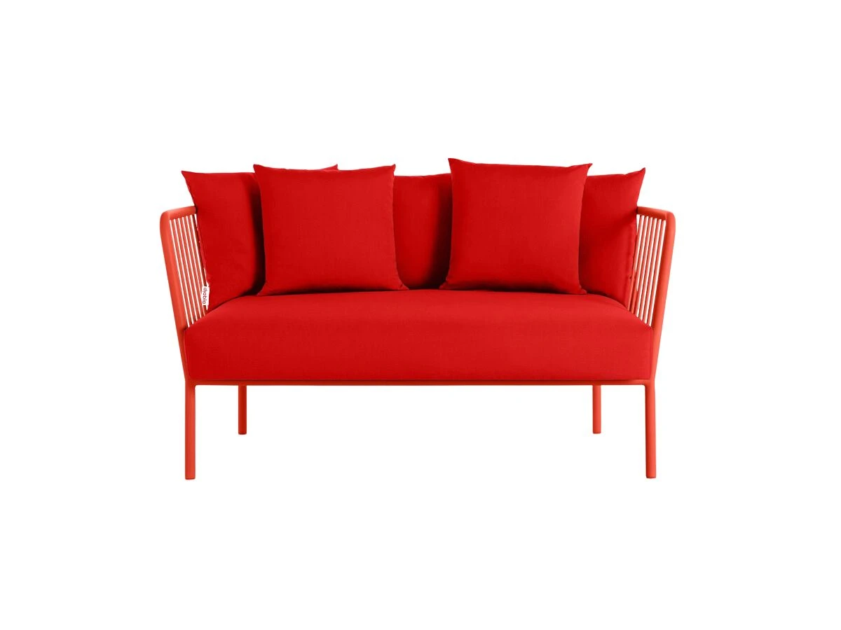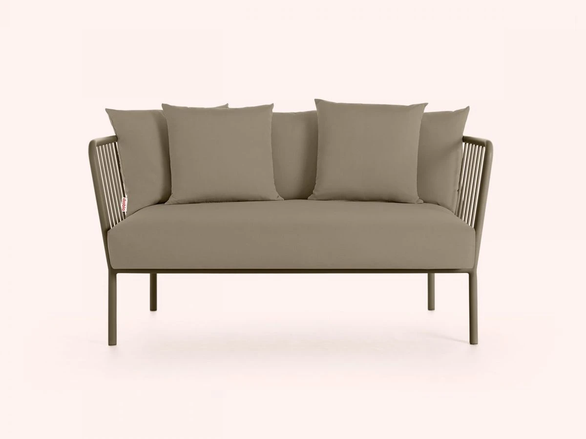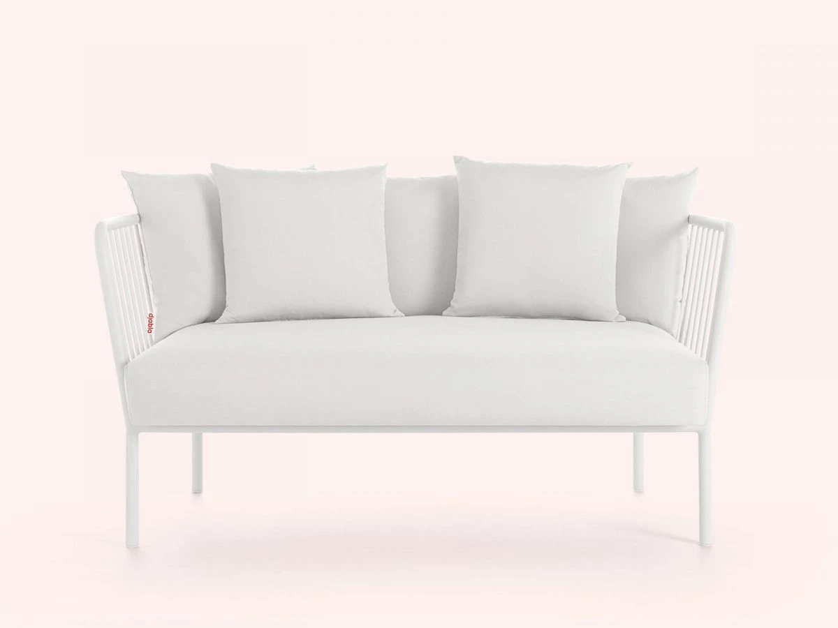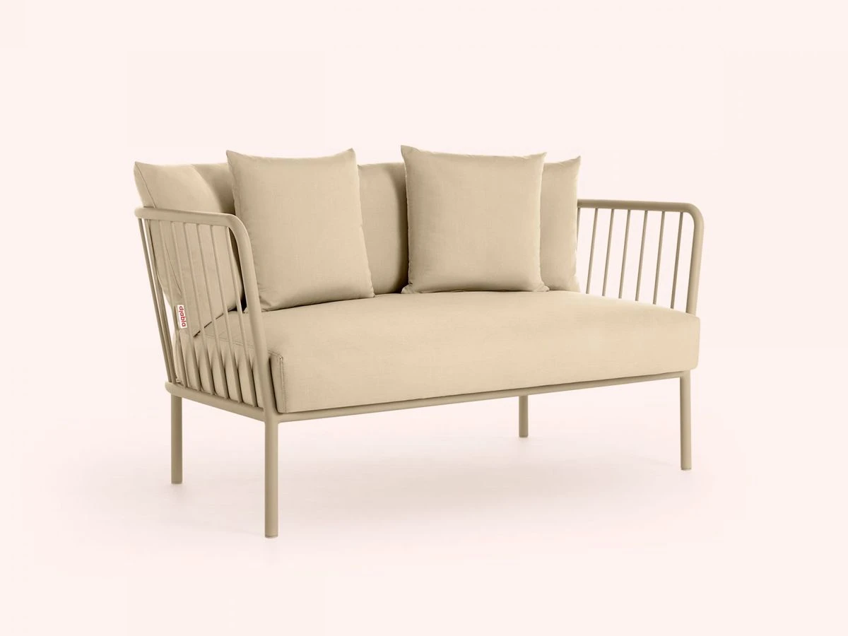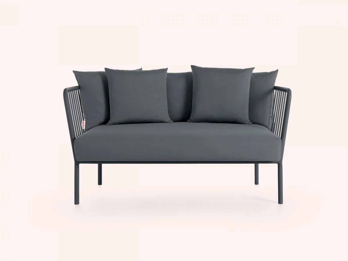 Two-seater sofa with a tubular frame in textured aluminium. Removable padding in polyurethane foam. Decorative cushions not included. Here available in 9 Plain fabric colours. For other information on other finishes, please do not hesitate to contact our Customer Service. Seat height 47 cm.