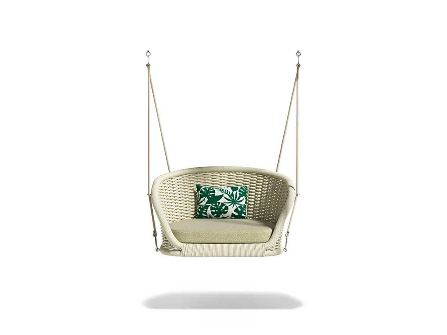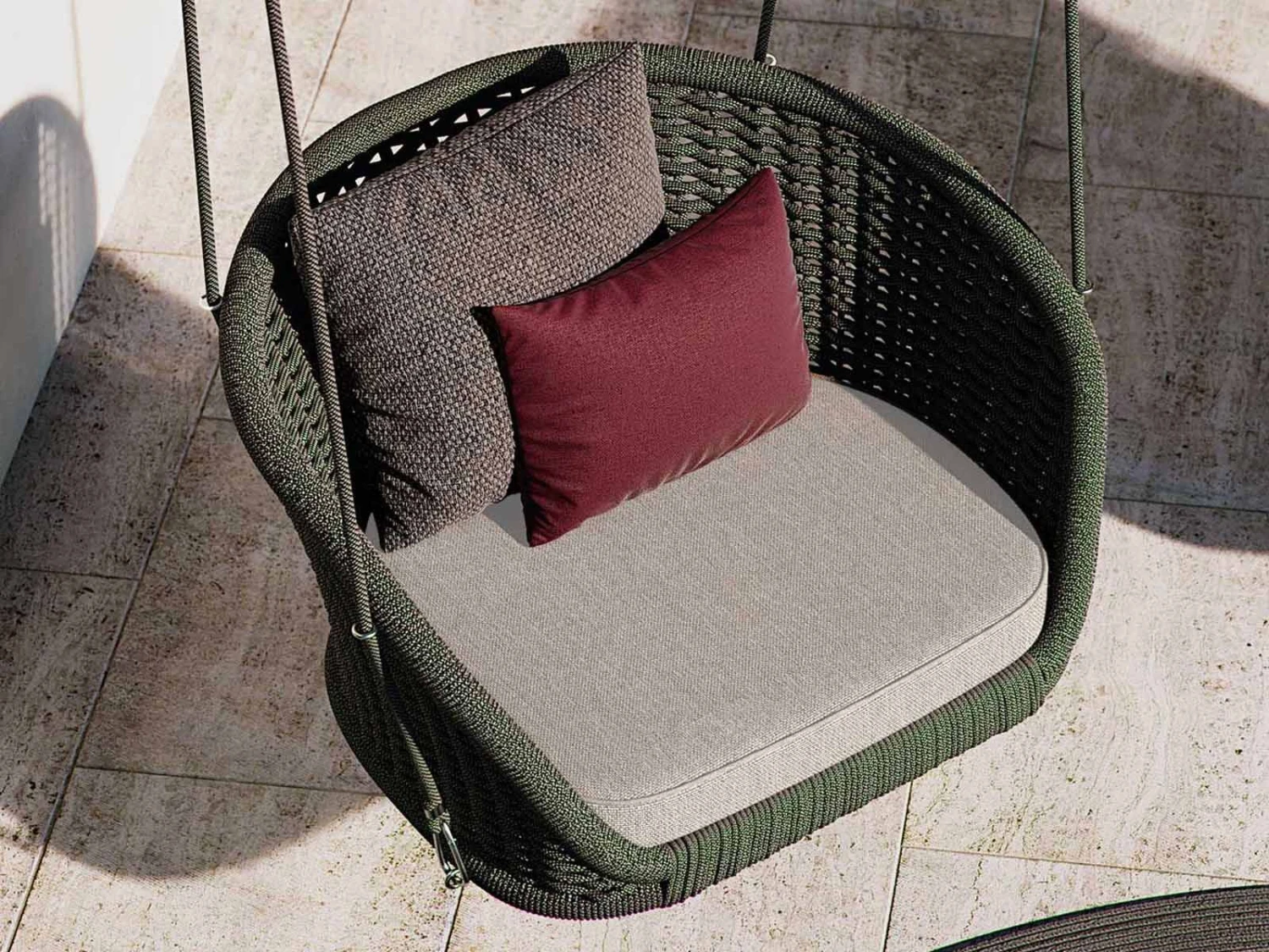 Combining the elegance of the suspension with the materiality of acrylic fibers, the refined hanging rocking chair Ludo releases an ethereal and timeless charm. A harmonious mix of lightness and resistance gives the seat a comfortable stability, recreating outdoor atmospheres of infinite class. The welcoming and ergonomic cushions, and the hand-woven texture in waterproof and easy-to-clean thermoplastic fiber, make this armchair perfect for relaxation areas, gardens, swimming pools or terraces, its comfort and elegance will make it an undisputed protagonist of every environment.