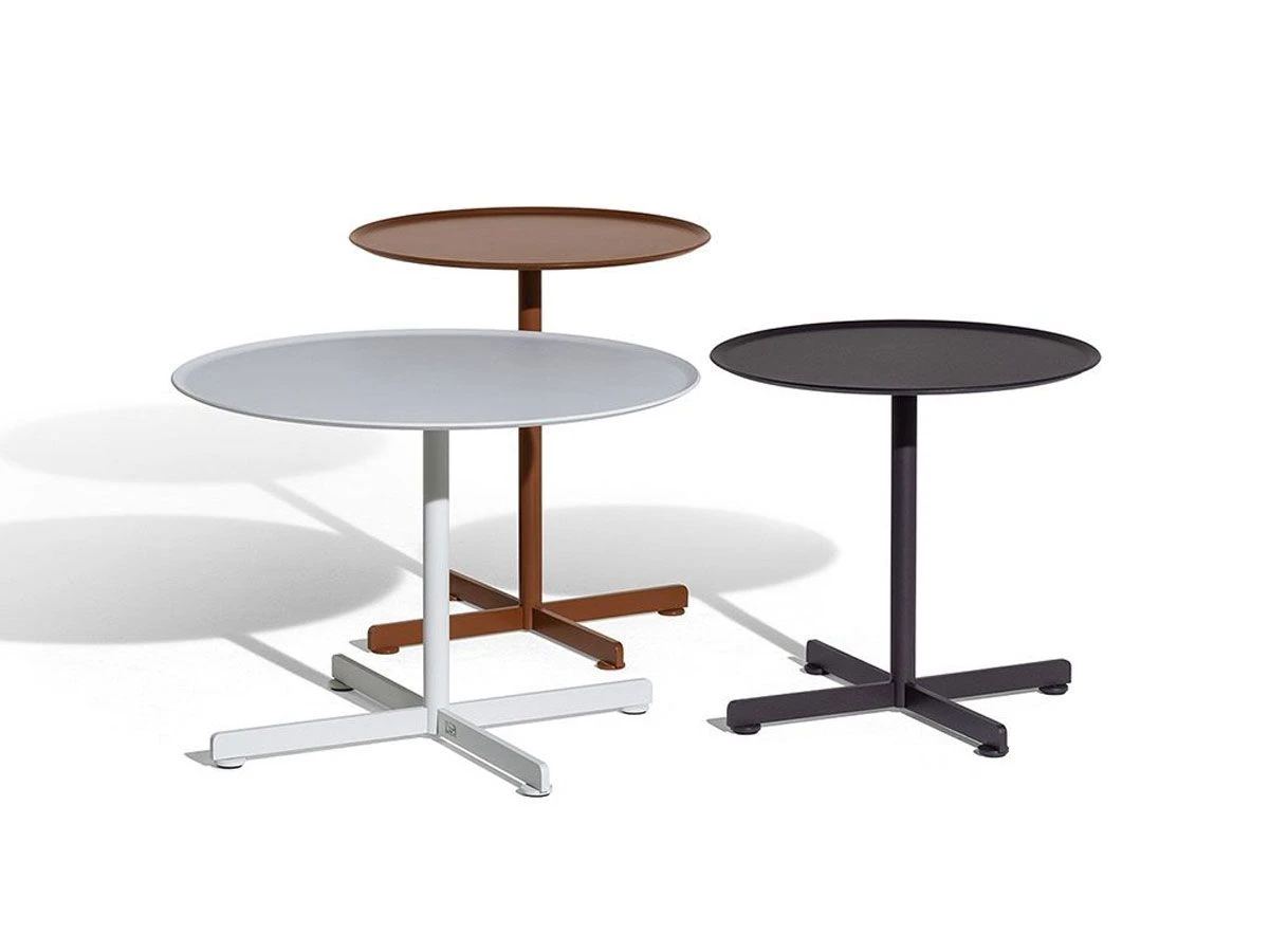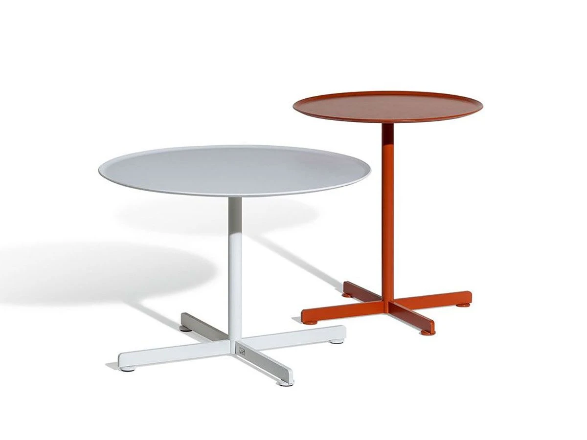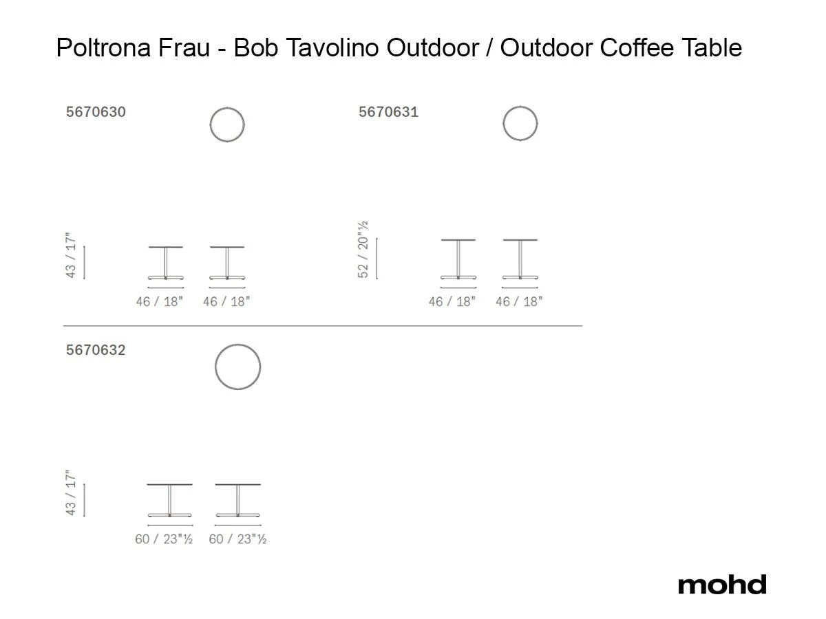 Bob is a collection of outdoor coffee tables designed by Jean Marie Massaud for Poltrona Frau. Stainless steel with textured epoxy powder paint finish. Available in three sizes and in the shades Gesso (RAL 9002), Basalto (RAL 8019), and Terracotta (RAL 8004).