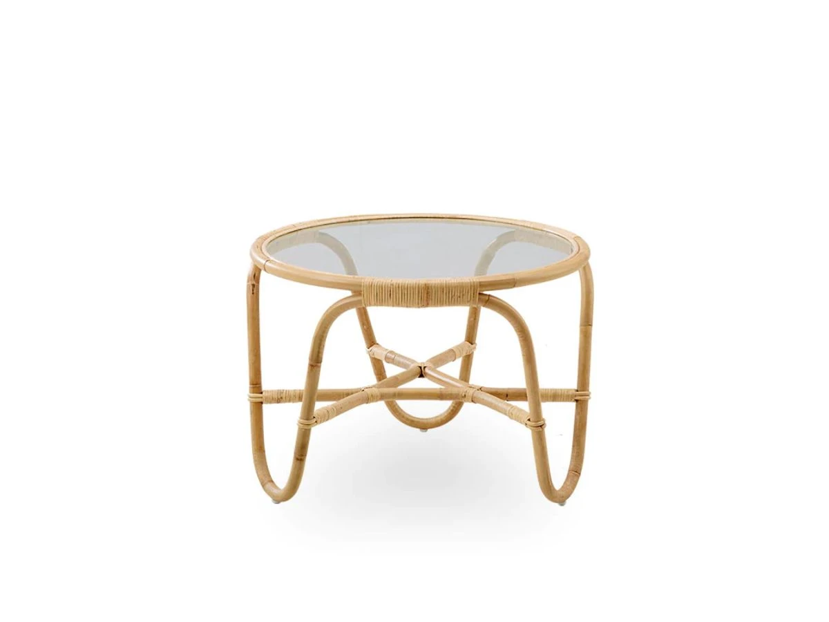 Round coffee table in hand-woven sustainable Indonesian rattan. Glass top.