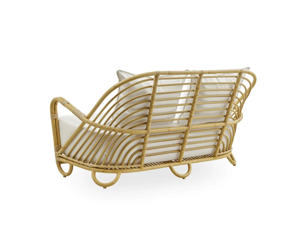 2 Seater outdoor sofa in powder-coated Alu-Rattan covered in ArtFibre, a UV-resistant polyethylene synthetic fibre. Quick Dry upholstery foam developed for outdoor use, quickly drains rainwater and maximises air circulation for quick drying. Cushions handmade to order in Denmark. Choice of upholstery fabrics from selected fibres for outdoor use. Seat height 40 cm. Armrest height 54 cm.
