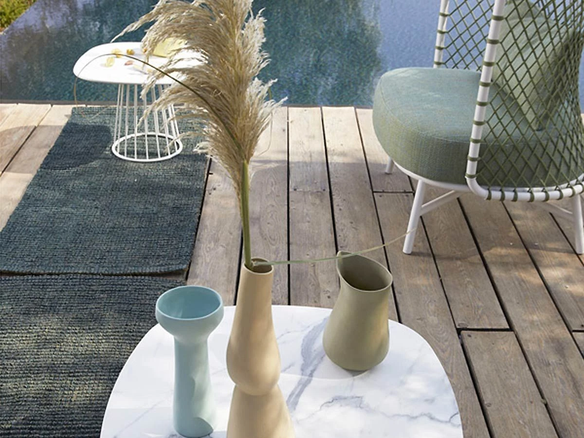 Outdoor rug made of coconut fibre treated with waterproof resins and woven by hand. Eco coconut fibre is very resistant to mould, moisture and bacteria and to mechanical wear and tear from rubbing and breaking. It has thermal and acoustic insulating properties. Colour Evergreen.
