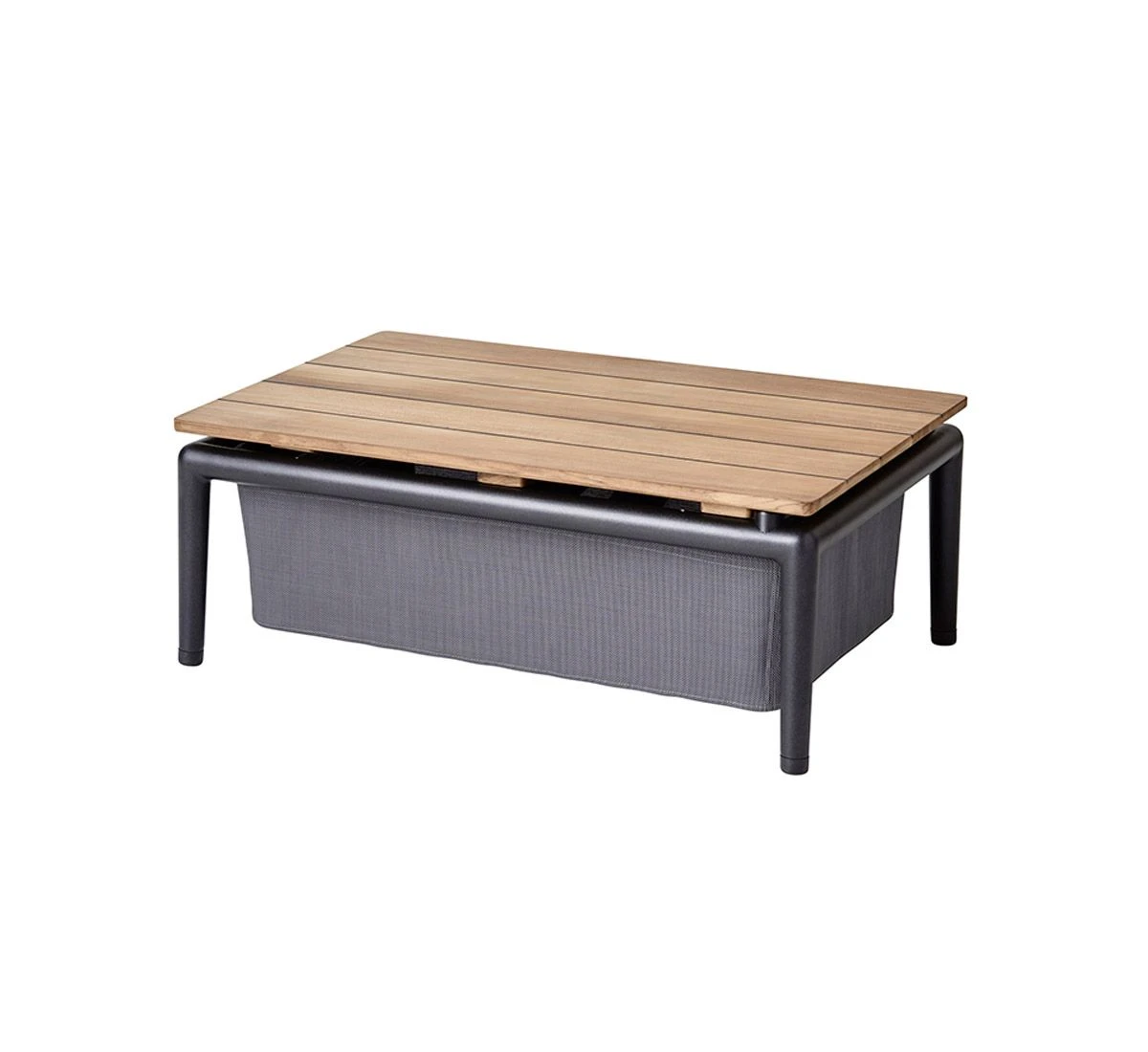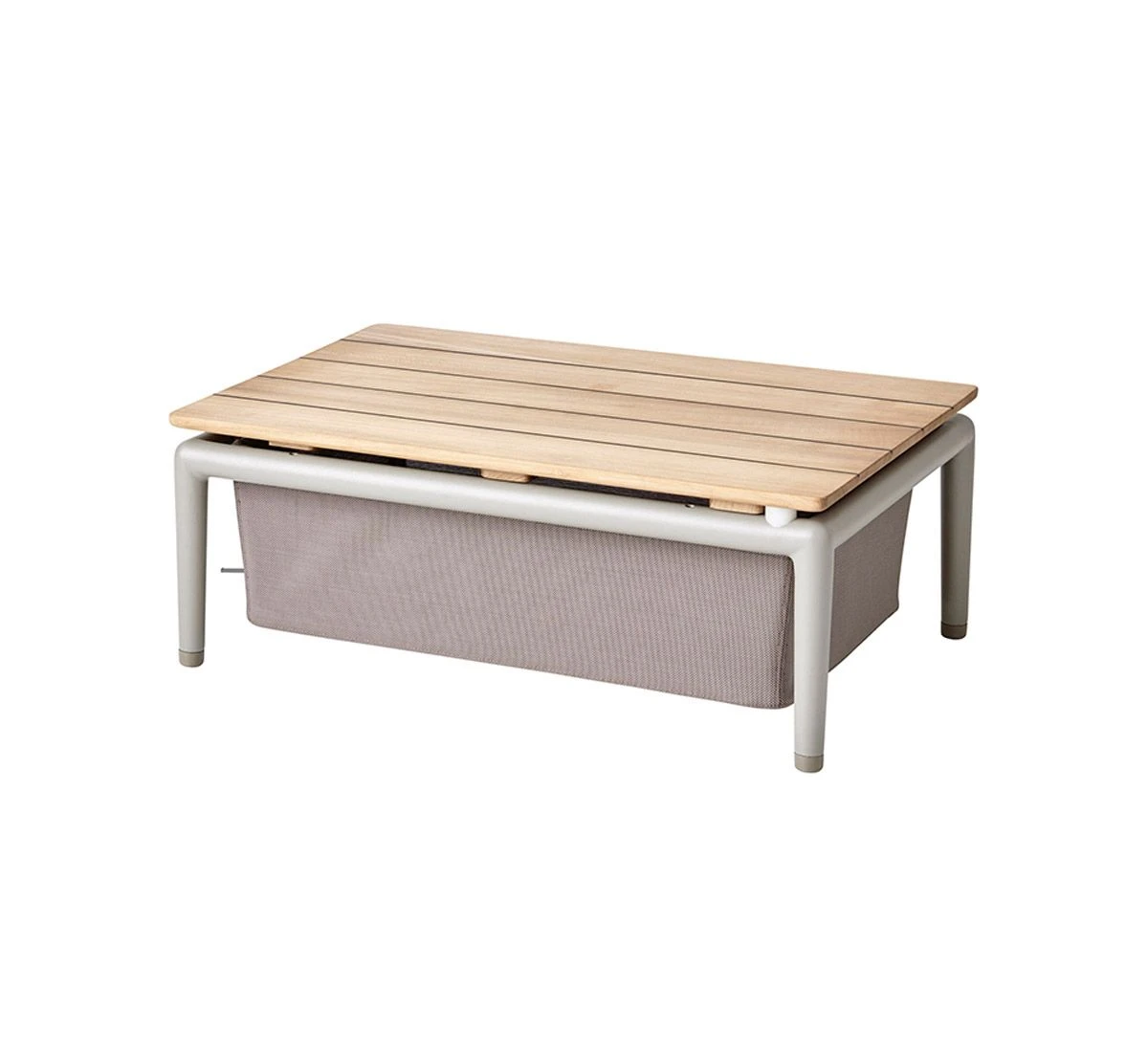 Box Table makes a practical and attractive addition to any otdoor settings. It offers pragmatism and contemporary design within one table. Constructed with a pivoting teak table top, an aluminum frame and textile basket, the modern outdoor coffee table uses its space efficiently while offering an elegant surface area for the lounging arrangement it occupies.