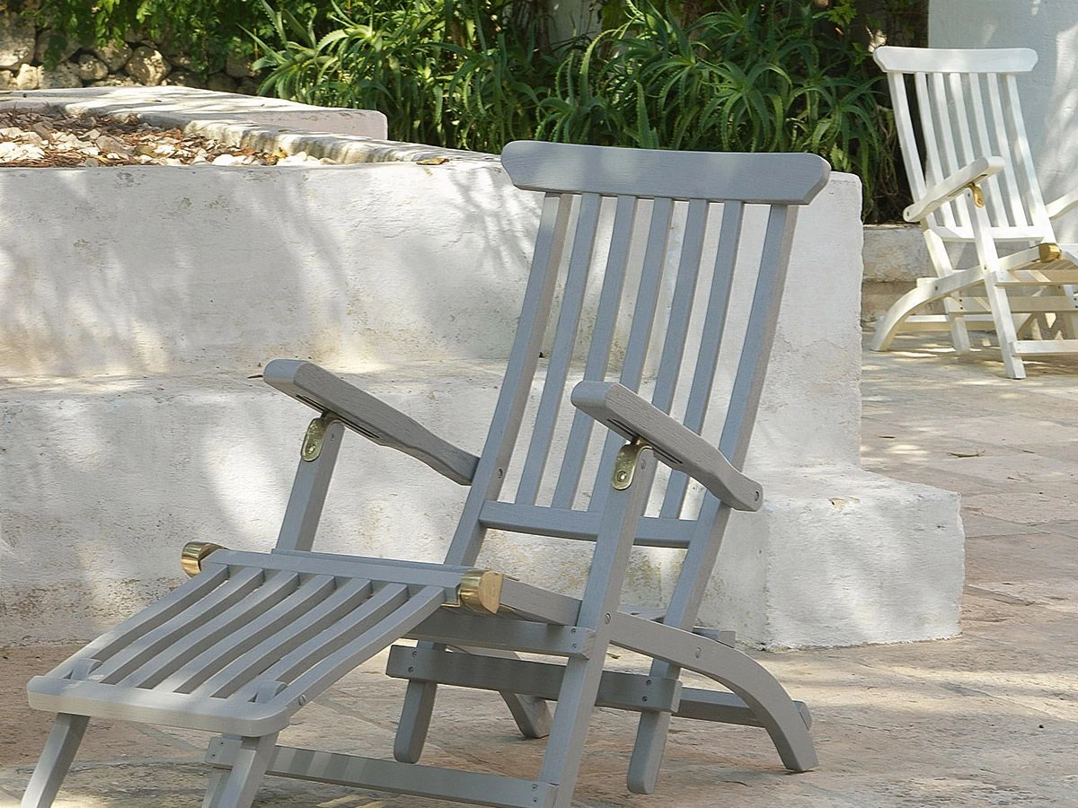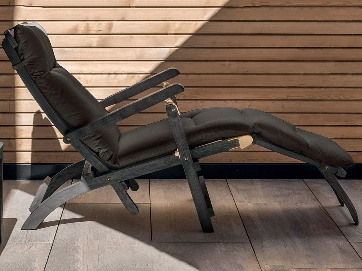 Cruise is part of the collection of outdoor seating proposed by Ethimo. With adjustable back in natural teak, with pickled finish or in mahogany varnished, brass details. Elegant and comfortable, perfect for any type of environment. Available in different colors. Seat cushion not included.