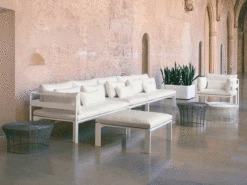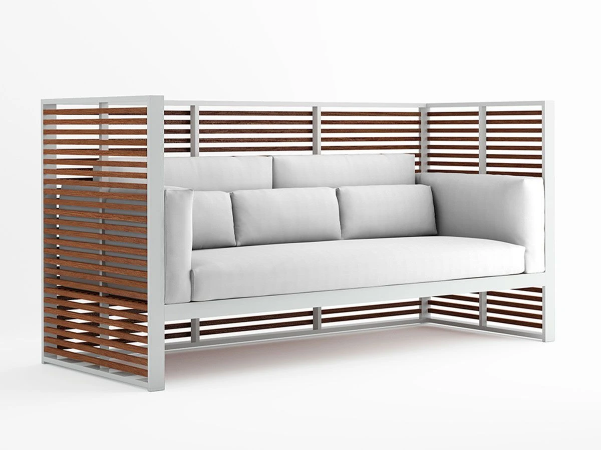 Dna Teak Normando is a 3 seat sofa designed by José A. GandÃa-Blasco Canales for Gandiablasco. Made of thermo-lacquered welded aluminium profiles and teak wood. Polyurethane foam rubber covered with water-repellent fabric. Removable fabric cover.