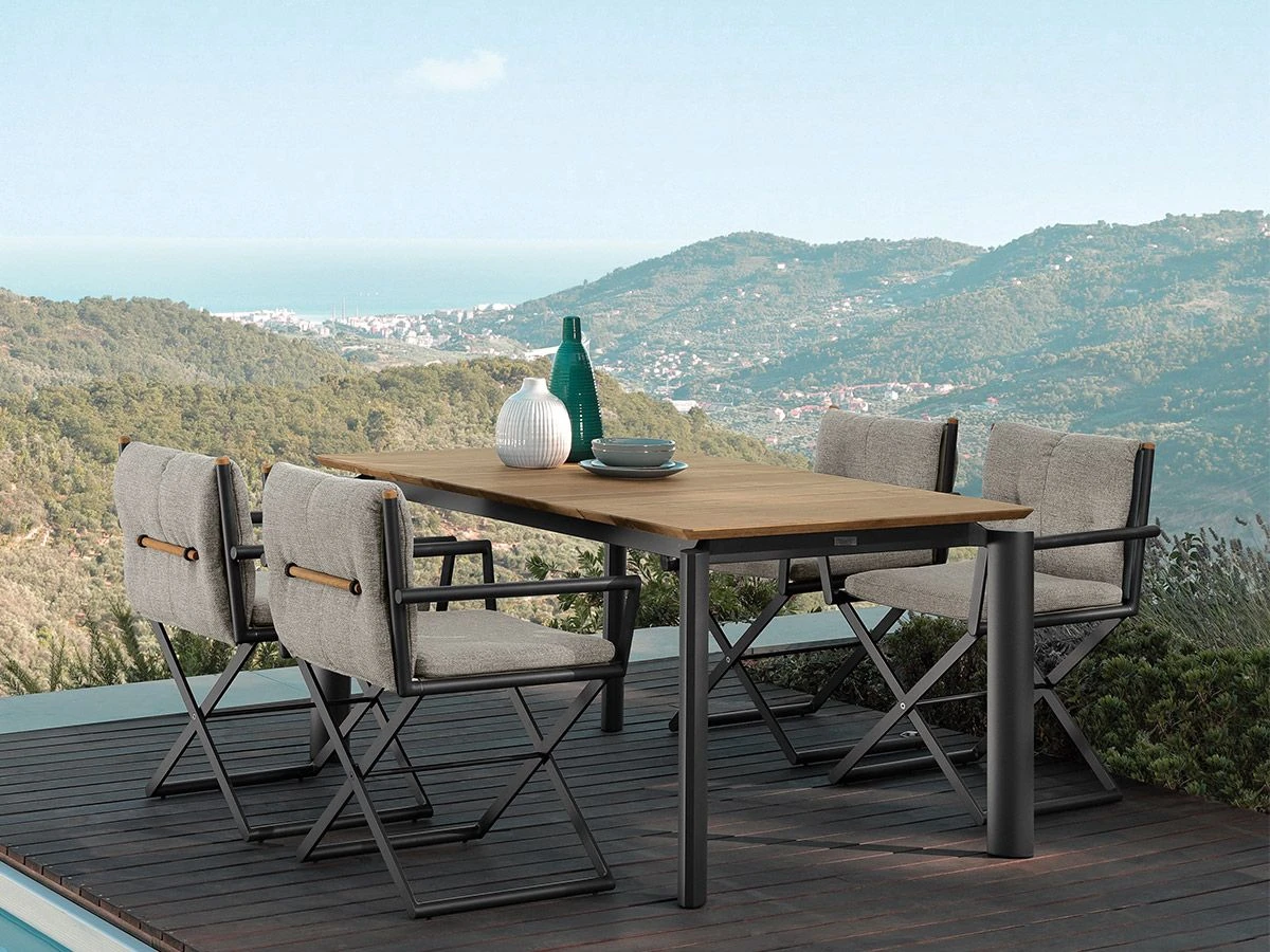 The Domino director chair is part of the new outdoor collection designed by Marco Acerbis for Talenti. It has a powder coating aluminium frame available in two different colours White, graphite. Two types of fabrics are available beige mélange for the white frame; grey for the graphite frame. Cushions with removable covers, easy to wash and weather resistant. Quick dry foam padding.