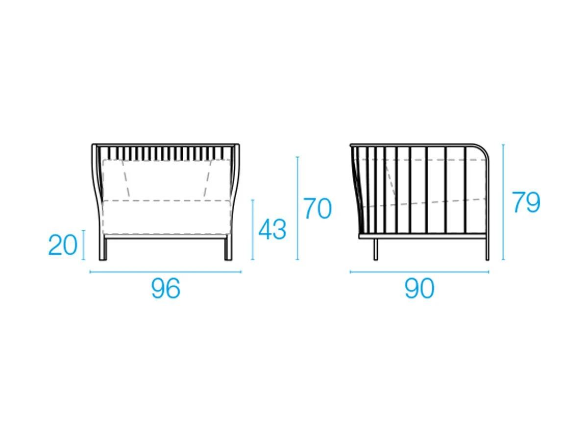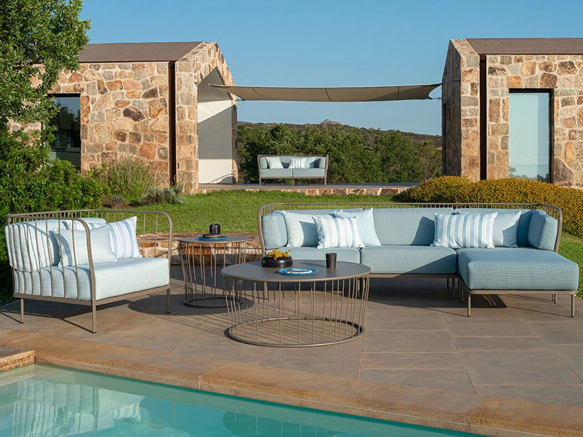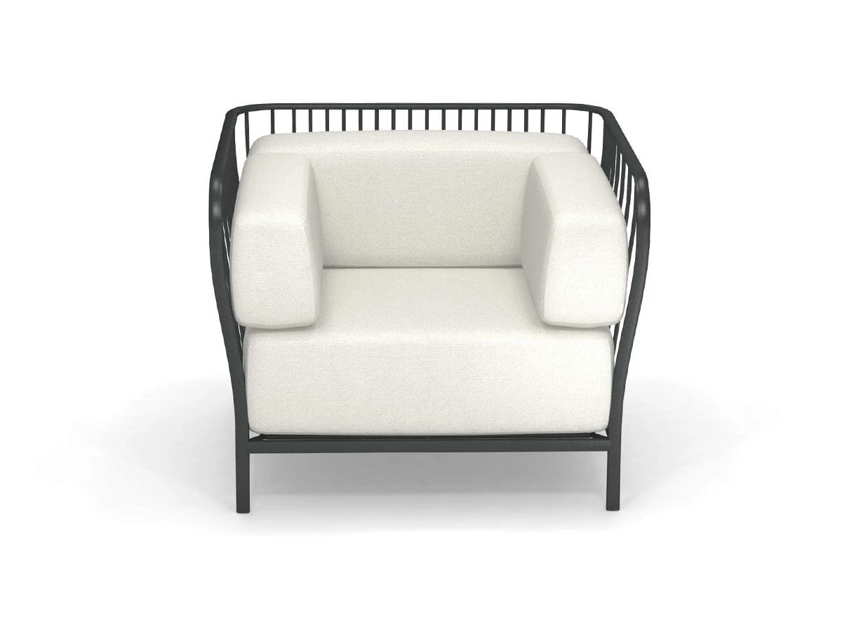 Minimalist and elegant design but above all comfortable the solid structure is accompanied by seat and back cushions and two armrests (decorative cushions not included) covered in Acrylic fabric in the Basic category, color choice. All Cannolè cushions are made of polyurethane rubber to which is added a layer of resin in polyester fiber, all packaged in inner pillowcase in water-repellent polyamide. Cannolè is a collection of outdoor products designed to live with intensity in the open air, the perfect solution for those who want to furnish their outdoor space with a cheerful idea, design and functional.