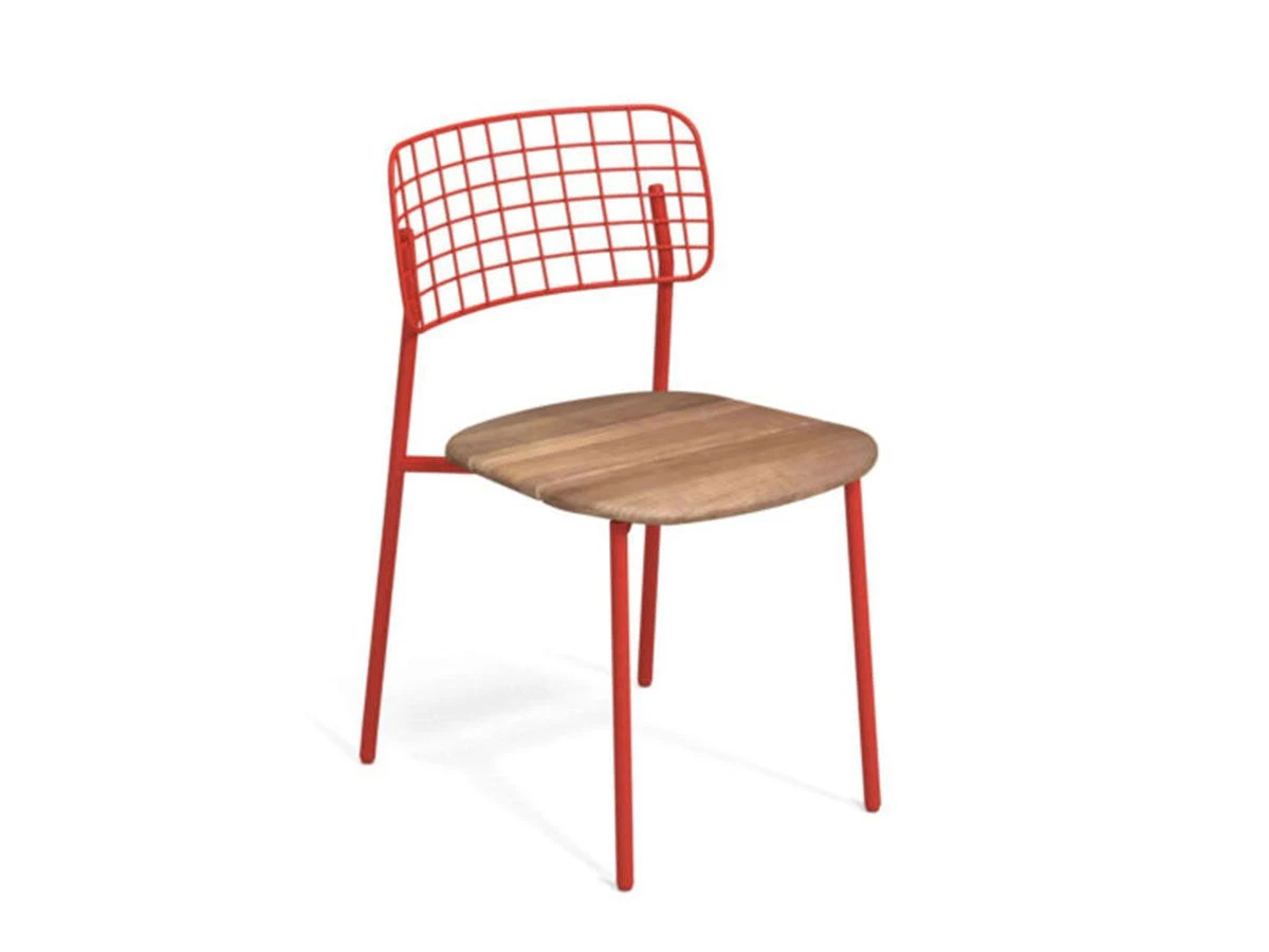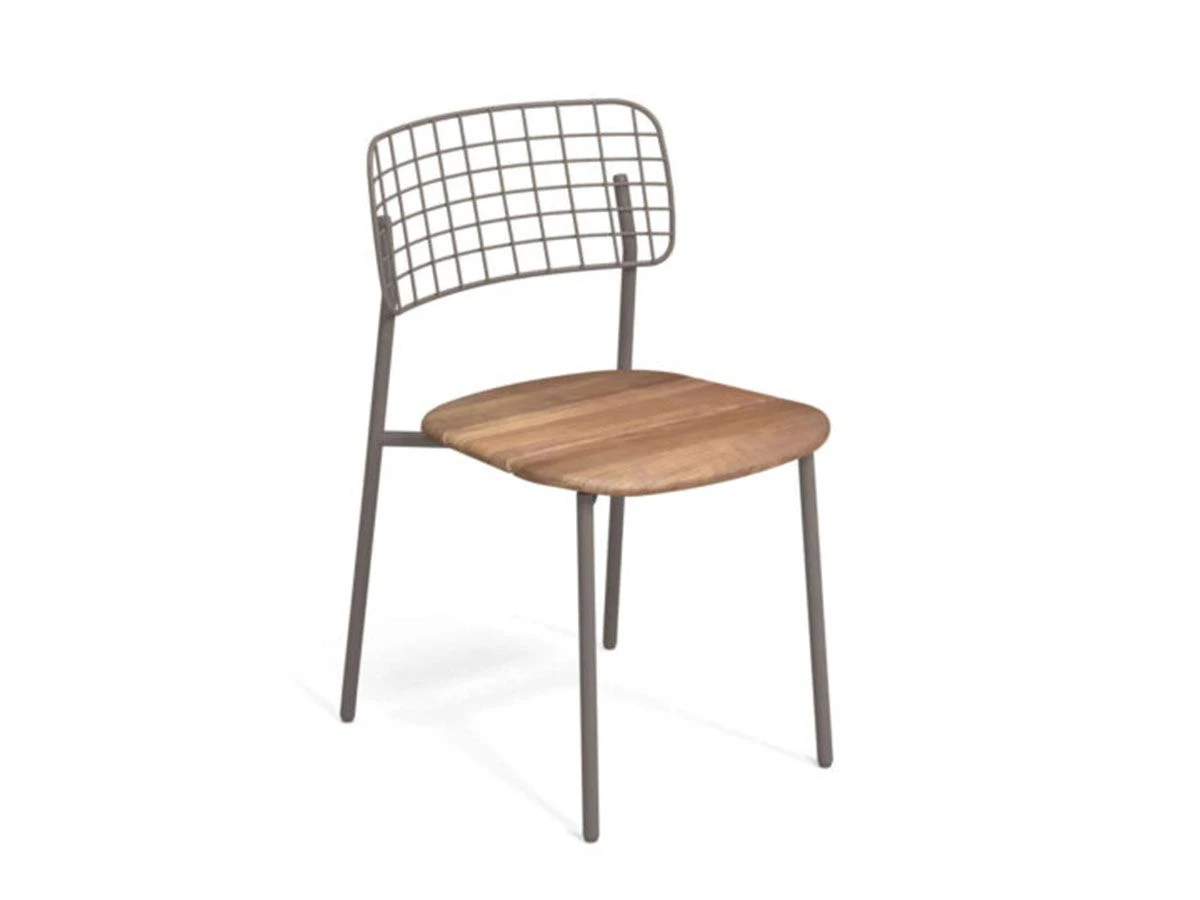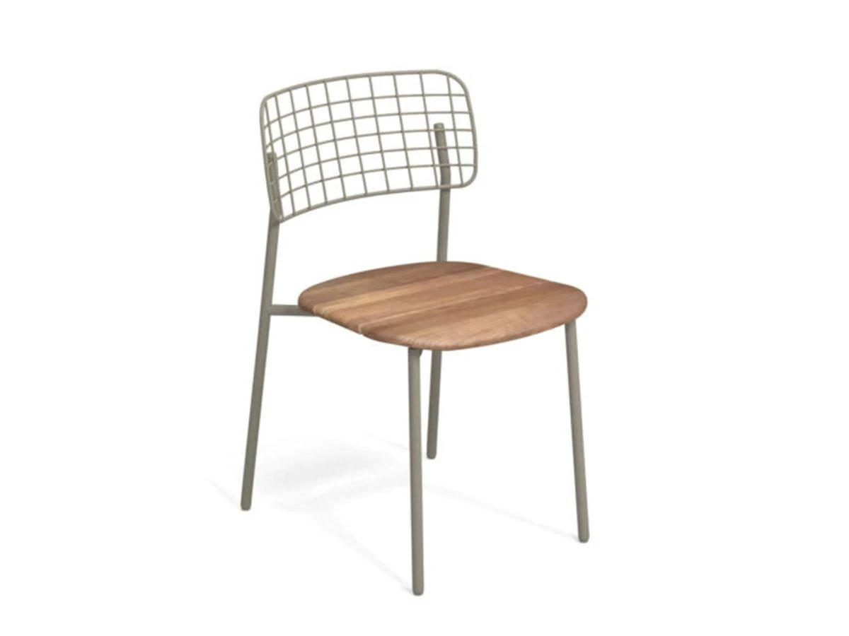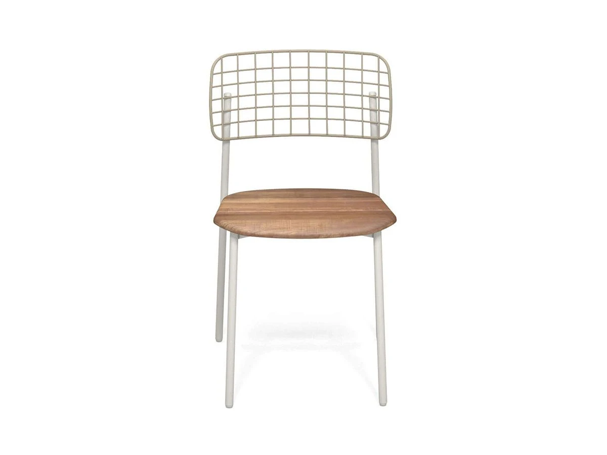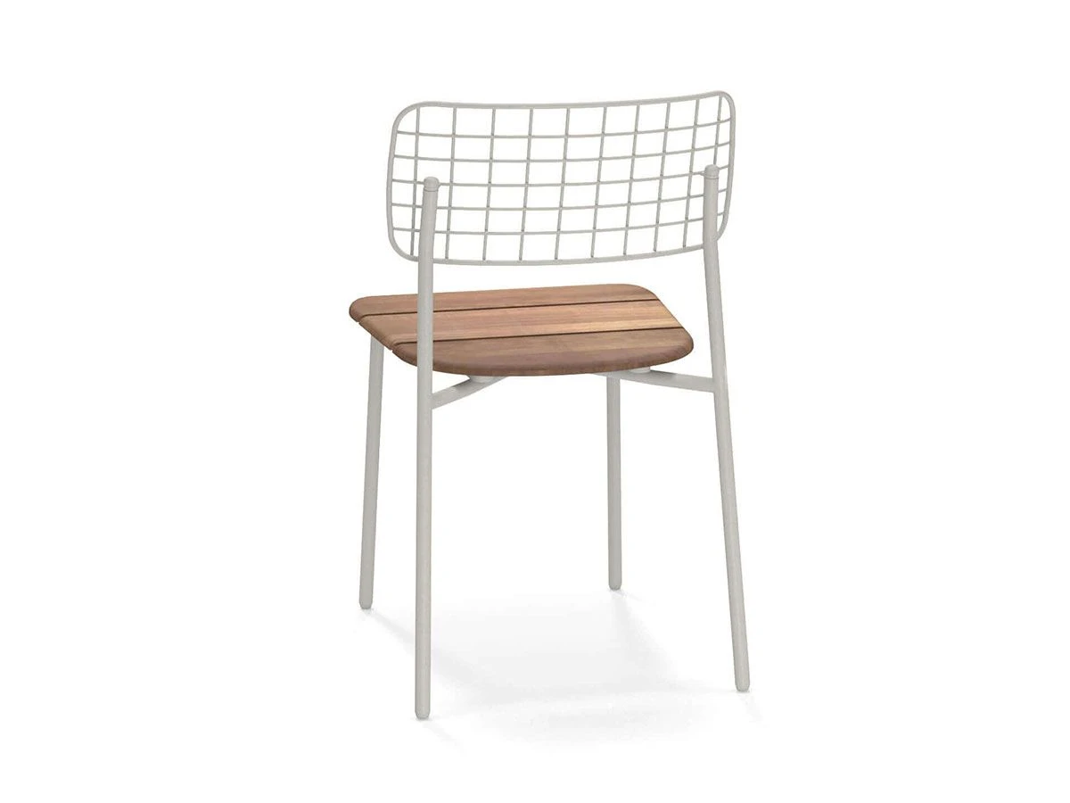 Lyze teak chair designed by Florent Coirier for Emu. Structure made of aluminum, back in stainless steel rods pre galvanized hot forming a geometric texture and sitting in fine teak. Structure and backrest are fixed mechanically by means of screws.
