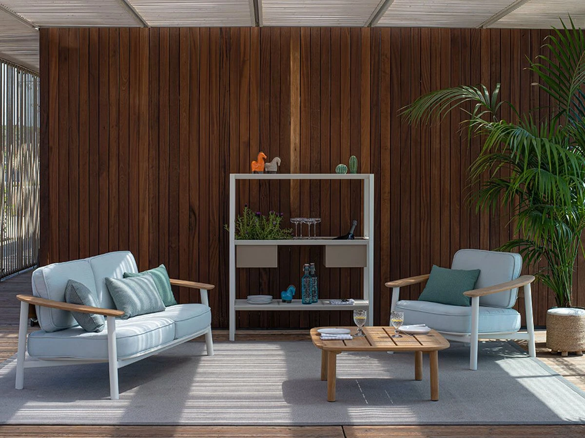 Twins is an outdoor furniture collection designed by Sebastian Herkner for the brand Emu. The series includes sofas and armchairs, chairs, tables, and coffee tables. The Twins collection is available in two versions one entirely in teak and the other in teak and aluminium. The aluminium parts are available in different finishes.