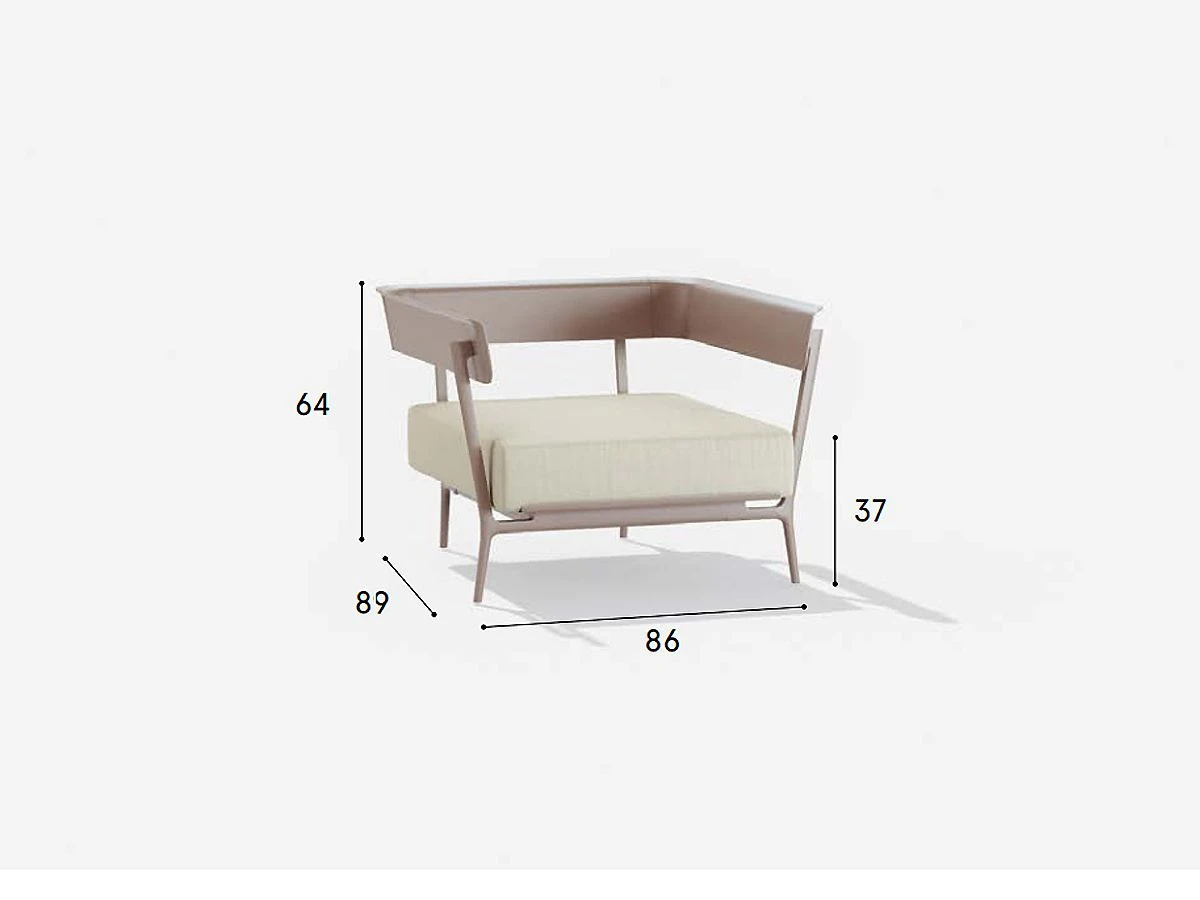Outdoor Armchair with armrests. Die-cast, extruded and laminated aluminium frame. Polyurethane or polyester powder coating. Polyethylene feet. Removable waterproof draining cushions with covers. Solids 100% acrylic fabric, stain-resistant, mildew-proof, water-repellent. 3-layer seat padding with variable lift and density. Seat height 37 cm