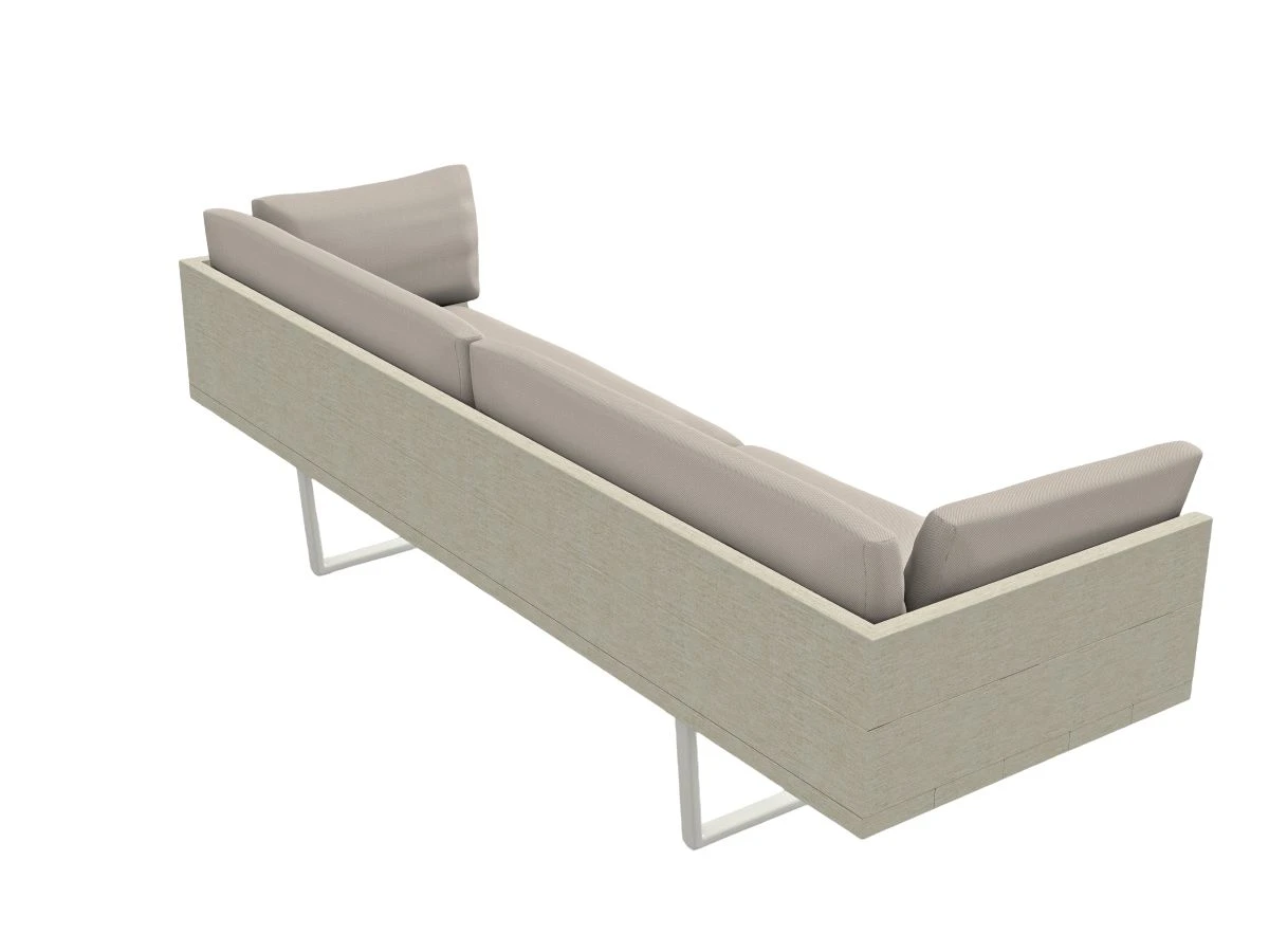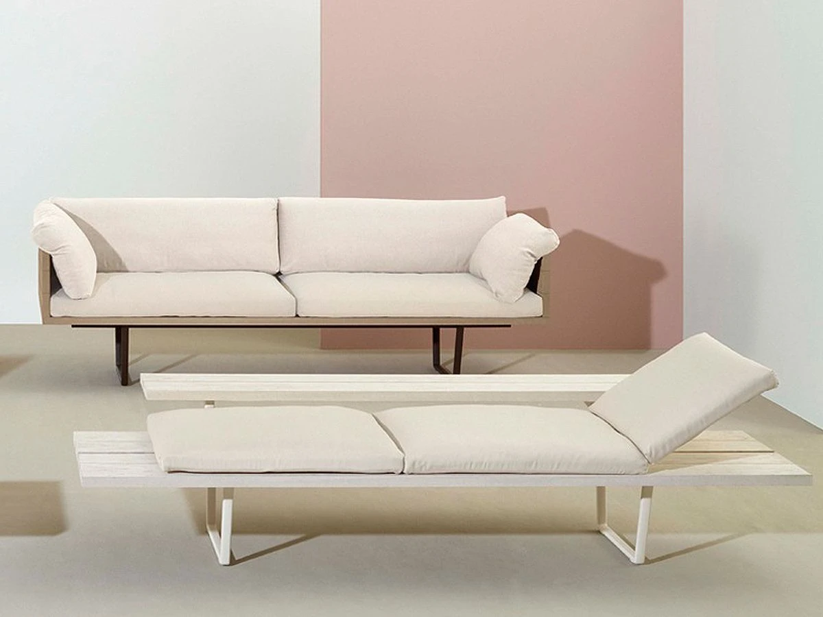 Orizon sofa has well-defined compact volumes that create a soft space to accommodate your body in maximum comfort. Soft cushions act as seat and backrest inside a geometric aluminium shell. The structure simulates the shape and grain of natural wood planks and, in some versions of the Orizon Sofa, even the colour of the material itself. If you prefer the NaturAll finish, you can combine the neutral tone of the wood with the uniform colour of the feet, otherwise you can choose to have the whole structure in a single colour. The merit of Orizon Sofa is the high possibility of customisation, guaranteeing resistance and quality of the aluminium worked by skilled Italian craftsmen.