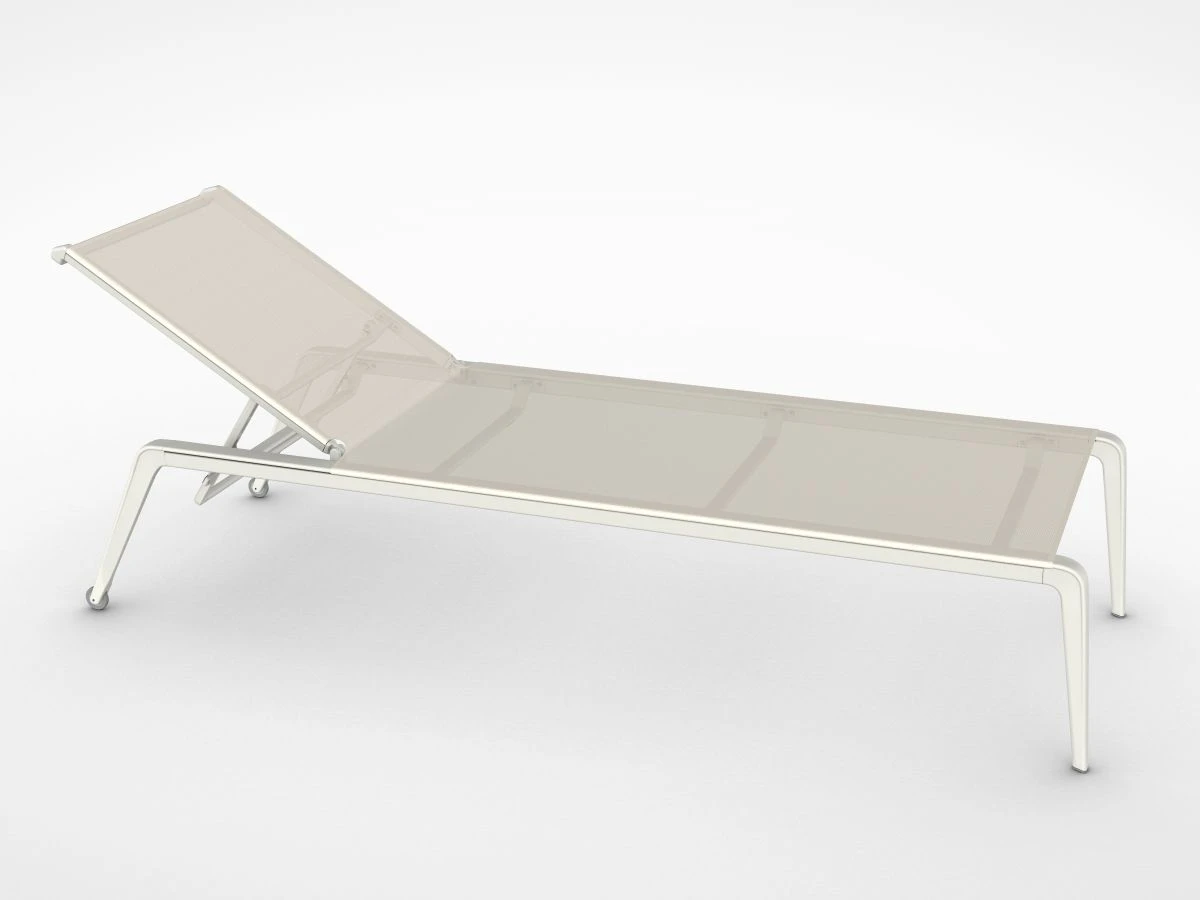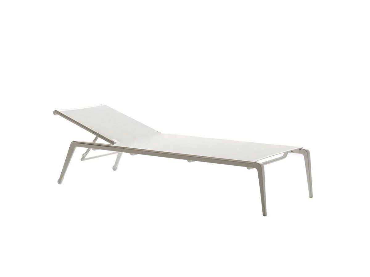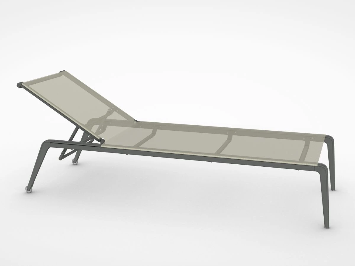 Outdoor sunlounger in die-cast and extruded aluminium with polyurethane or polyester powder coating. Cover in Batyline© fabric, solution-dyed PVC-coated polyester, tear-resistant, quick-drying, highly UV-resistant and mould-resistant. Lounger can be customised with 14 colours of aluminium frame and 7 shades of Batyline©. Adjustable backrest. Polyethylene wheels and feet. Stackable up to 3 pieces. Cushions not included.
