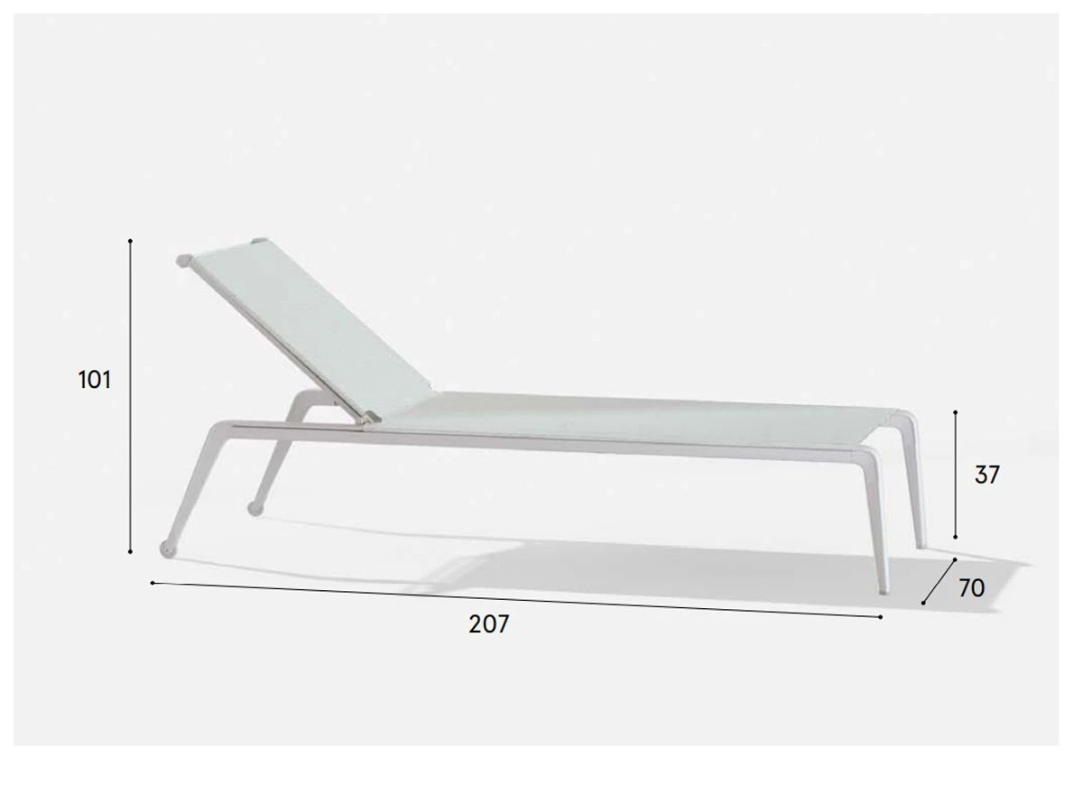Imagine your holidays lying in the sun on a Ushuaia sunlounger, by the pool or with the scent of freshly cut grass, enjoying comfort and peace. The structure of the Ushaia sunlounger is made of aluminium, equipped with practical wheels and stackable, designed so that even storing them does not cause stress thanks to the lightness of the materials and the line that also contemplates manageability. The fabric chosen for the seat is Batyline©, which is tear-proof and mould-resistant, quick-drying and UV-resistant. Choosing your ideal position is easier thanks to the possibility of reclining the backrest in 7 different positions.