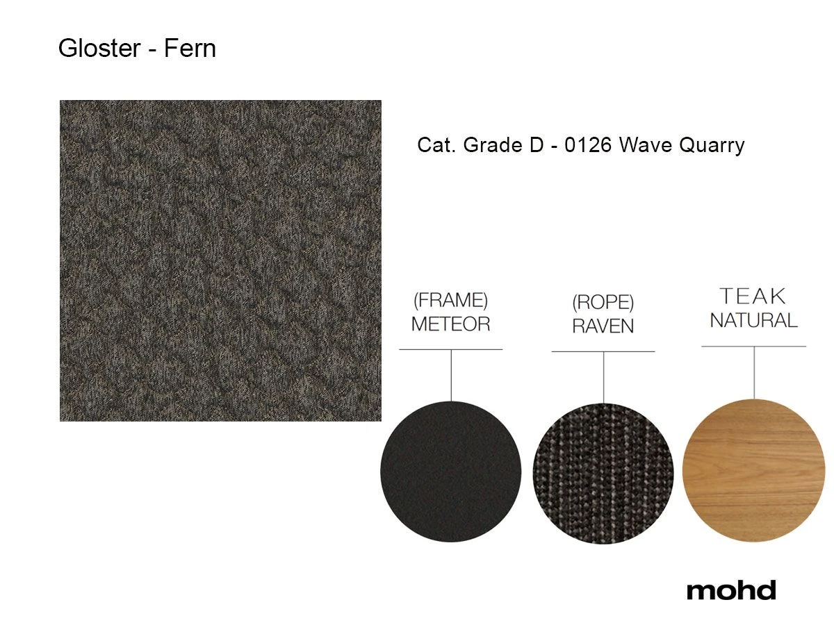 Fern is a high-back lounge chair designed by Sebastian Herkner for Gloster. Structure in natural teak and back in meteor aluminum and rope. Seat and back cushions in Wave Quarry outdoor fabric.