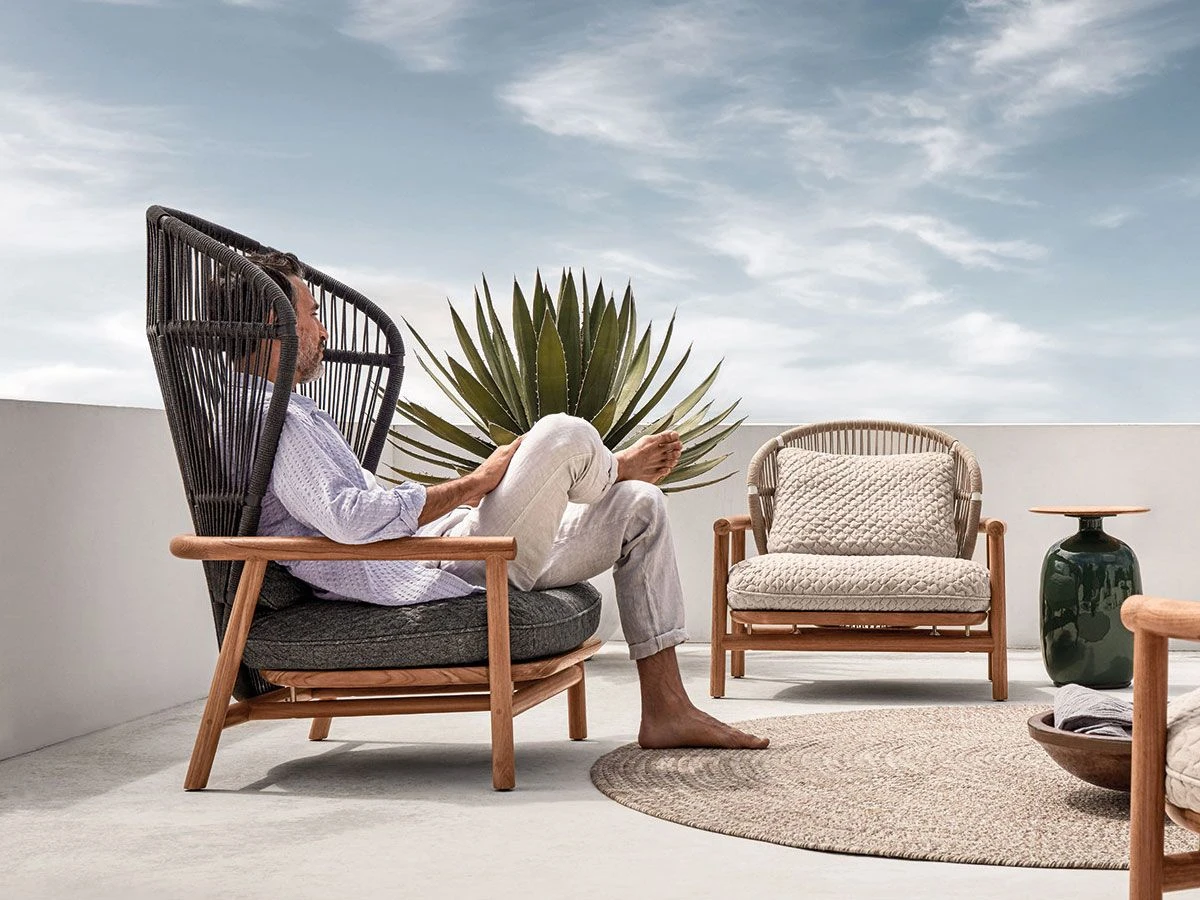 Ferm is a collection of seats inspired by the fronds of an unfurling fern leaf, that unfolds creating an organic and delicate shape. The natural teak structure is expertly combined with the warm shades of the intertwined cords of the enveloping backrest and cushion coverings. The Fern collection is design furniture that fills the space thanks to the proportionate dimensions, the personality of the design, and the strong presence of a unique and precious material such as teak, in perfect Scandinavian style. To furnish your outdoor environment, terrace, or garden, let yourself be conquered by Fern, a warm and inviting collection that will make the open-air space unique and convivial.
