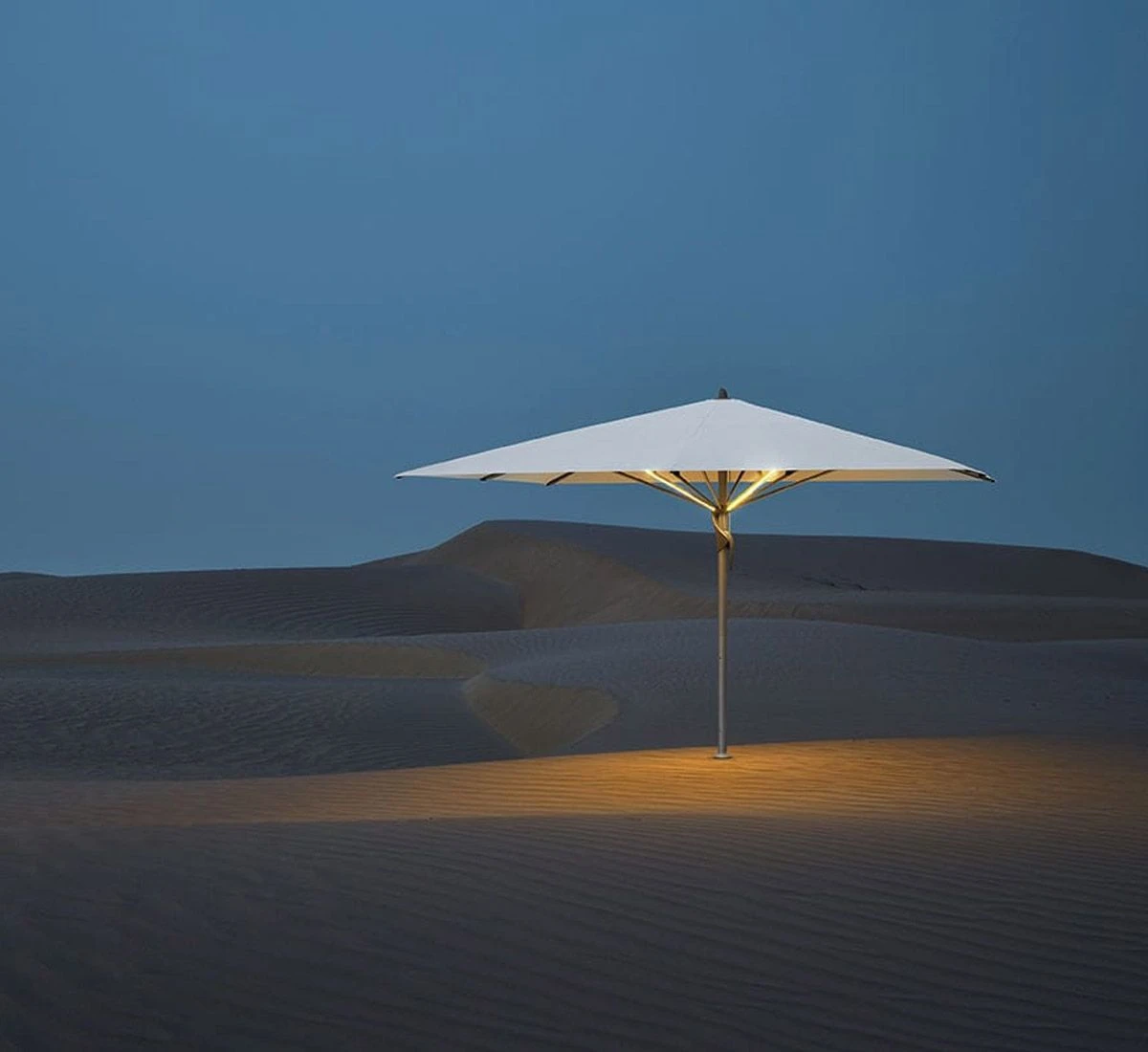 Fortello LED is an umbrella designed for both private, public or contract environments. Fortello LED is the umbrella for day and night, thanks to the LED, integrated in the struts, also the counter-rotating servo opening principle, both are easy to operate and with their detachable pole and light weight they are convenient to move and use in a variety of settings.