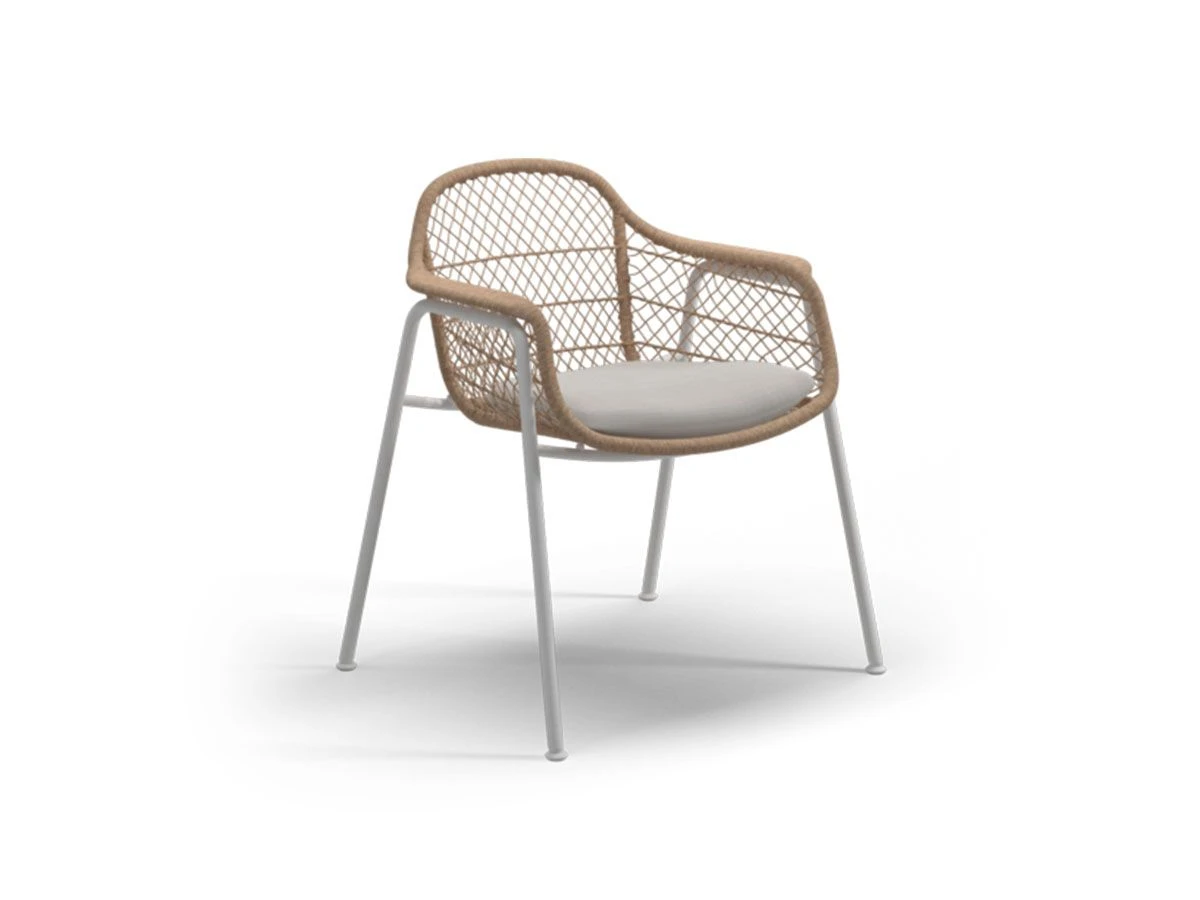 Fresco chair designed by Mark Gabbertas for Gloster. Chair with a fresh soul like its name, characterized by a slender structure in white powder-coated aluminum and shell in woven wheat-colored wicker. To make it even more comfortable, it is equipped with a seat cushion in fabric for outdoors, the color of your choice.