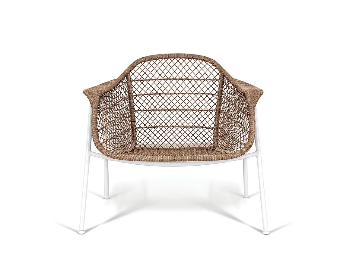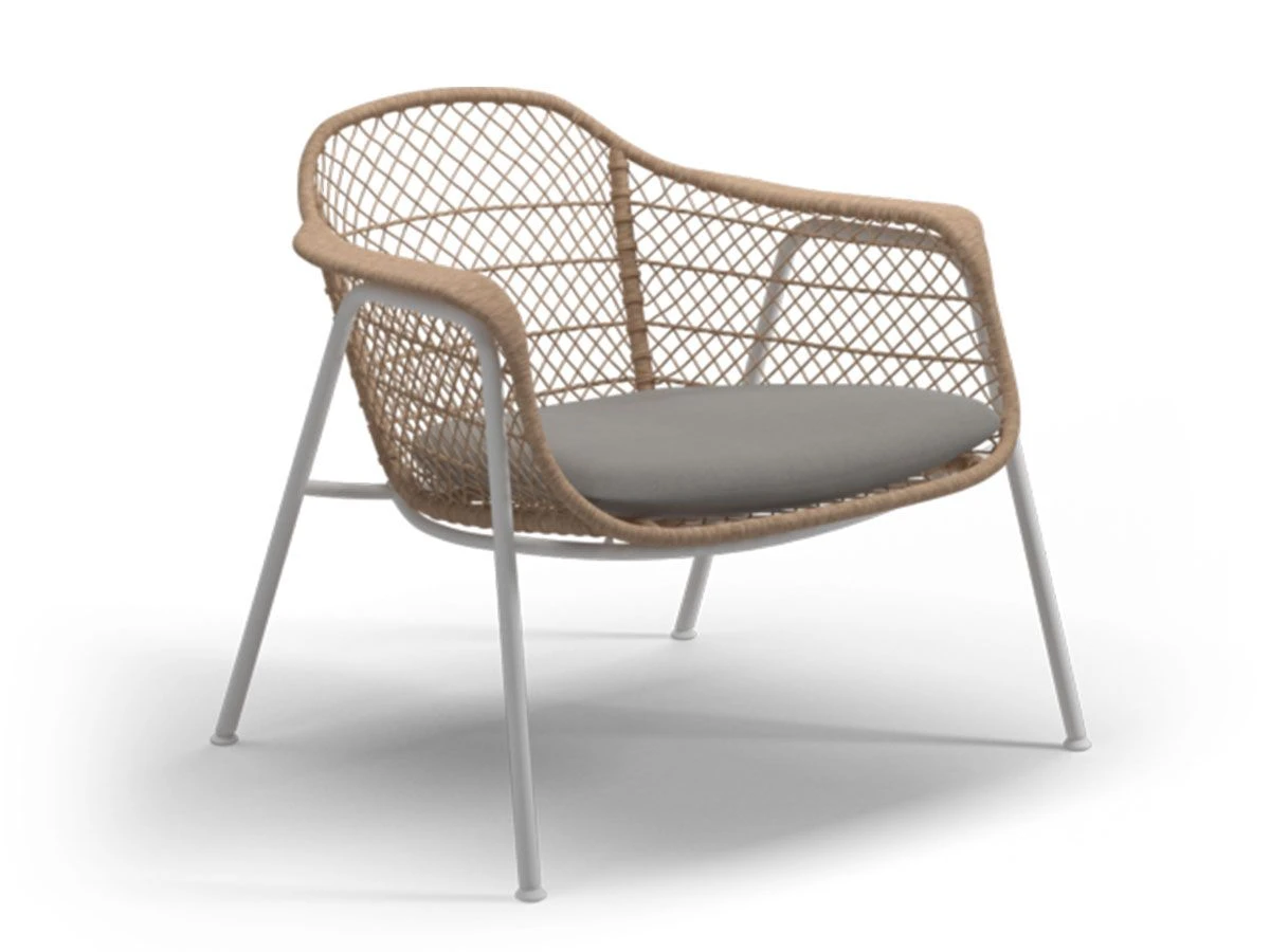 Fresh lounge chair designed by Matteo Thun for Gloster. Armchair with a fresh soul like its name, characterized by a slender structure in white powder-coated aluminum and shell in wheat-colored woven wicker. To make it even more comfortable, it is equipped with a cushion seat in outdoor fabric, color of your choice.