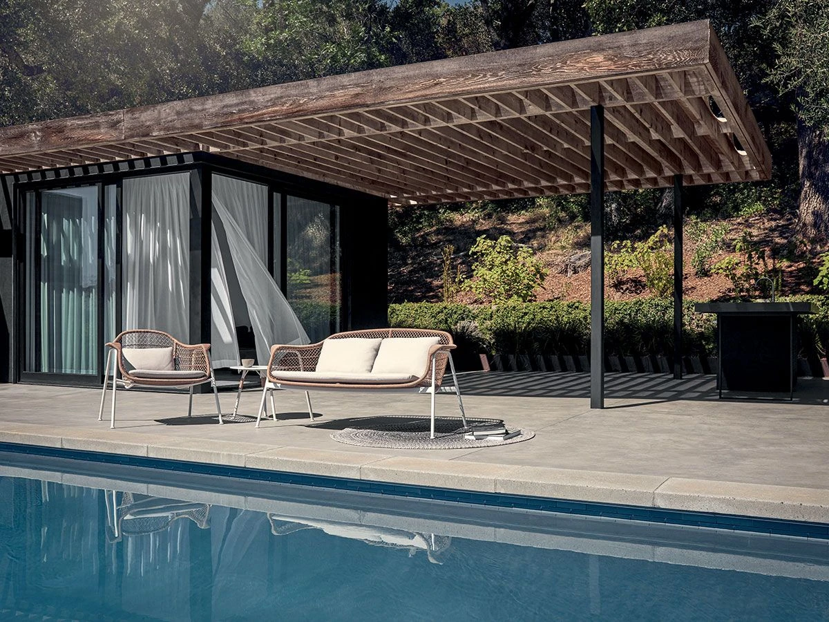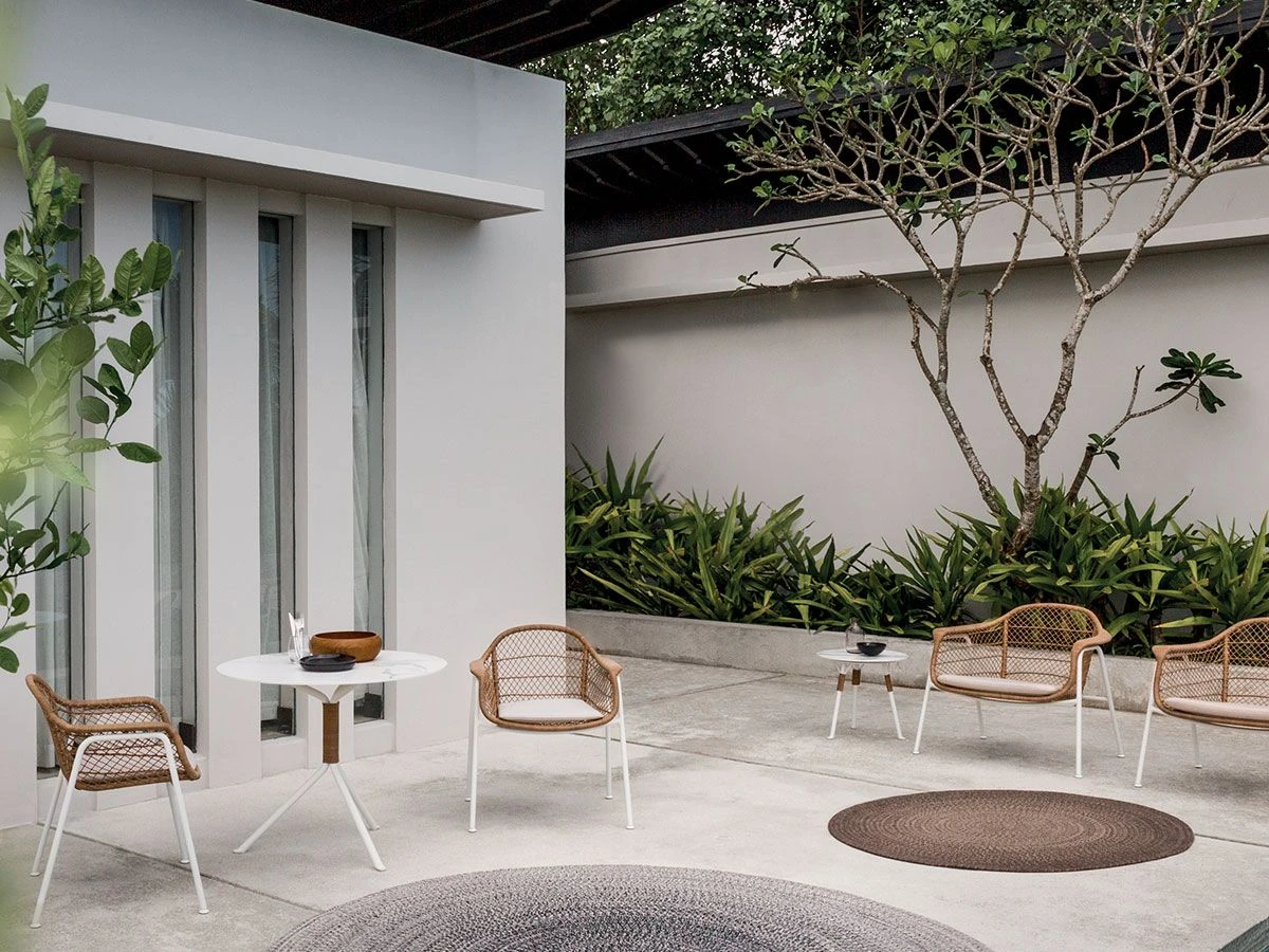 Outdoor lounge chair, born from the creativity of Matteo Thun who is inspired by the freedom and style of the 60s. Sophisticated and timeless armchair that reinterprets and combines the characteristics of new materials, grasps the advantages of environmentally friendly processes, chooses materials durable but comfortable and practical and he studies the details meticulously and makes them by hand. The chic style of yesteryear meets the interdisciplinary process that focuses on aesthetic coherence, durability and future durability.