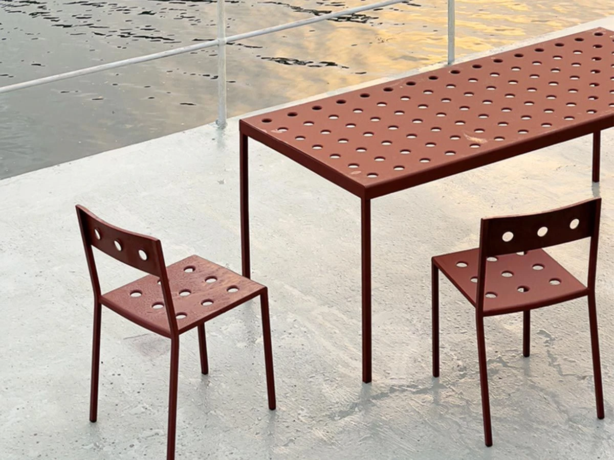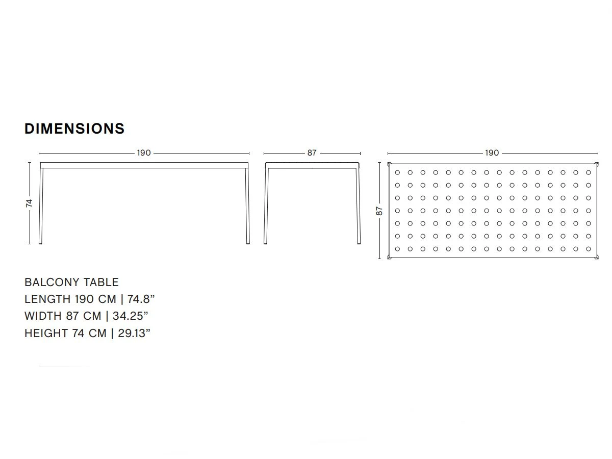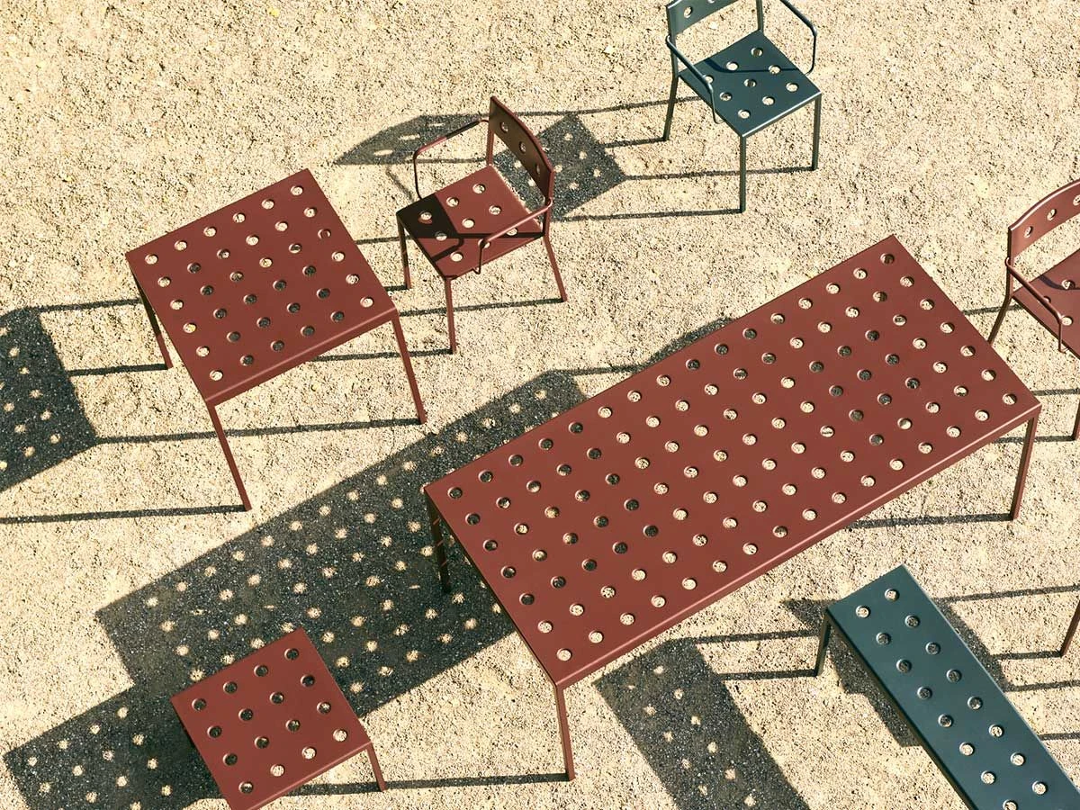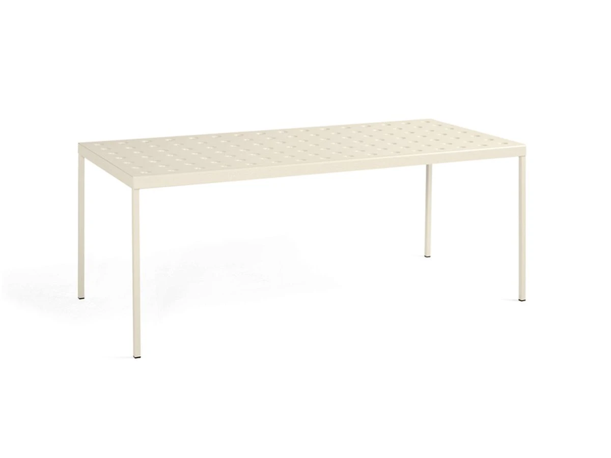 Enjoy the warm seasons staying outdoors with yours friends. Balcony Table L. 190 is the largest outdoor table in the Balcony collection, designed for sharing lunches and dinners in good company. It furnishes gardens or terraces with the simplicity and class typical of Scandinavian design, known for its attention to robustness and durability of its furniture. Hay’s Balcony Table is made from primed steel that will withstand the elements, and the top has circular holes that are not only decorative but also strengthen the structure and prevent rainwater from stagnating. Combine it with benches or chairs from the Balcony collection to create a harmonious garden experience.