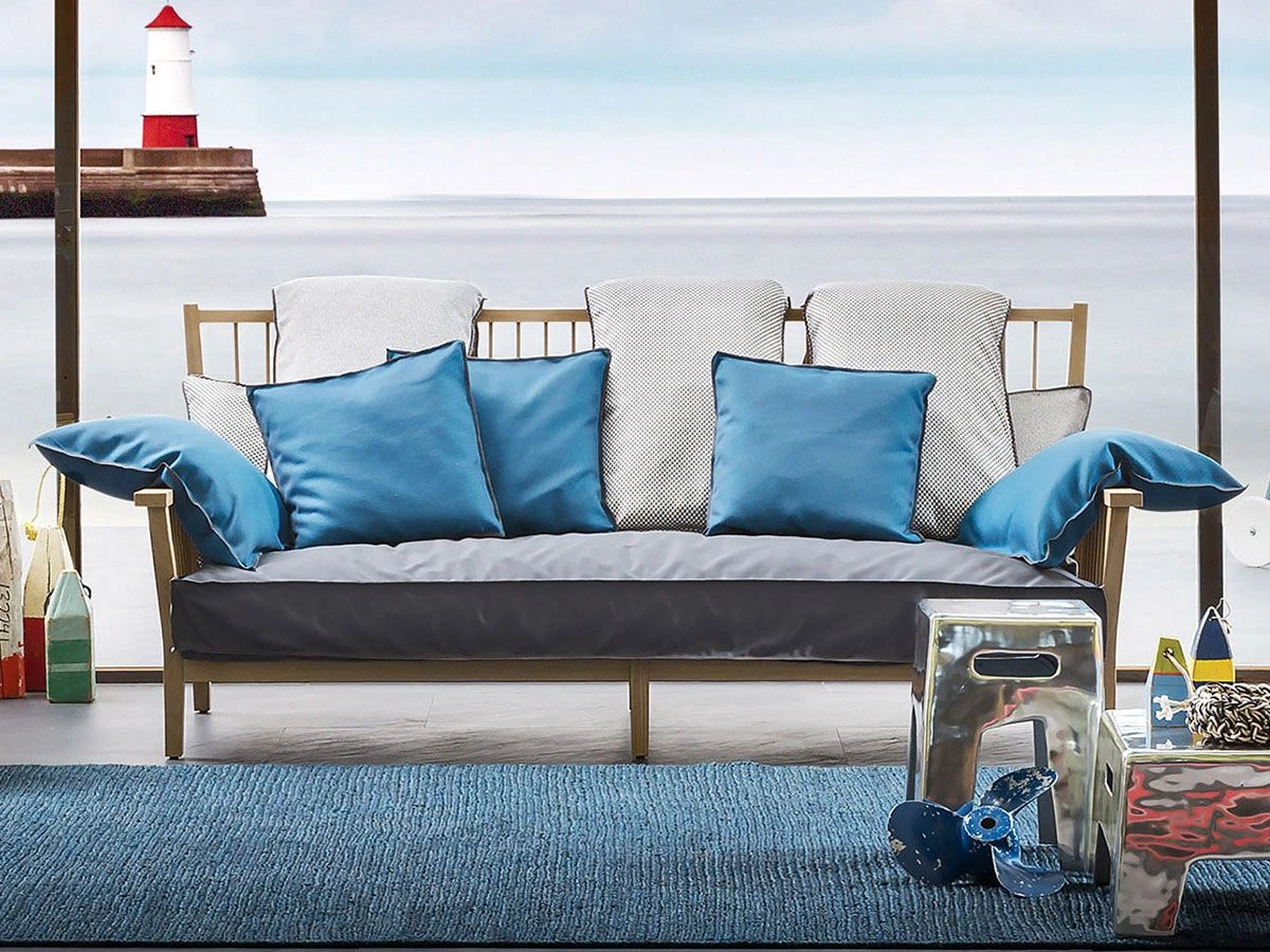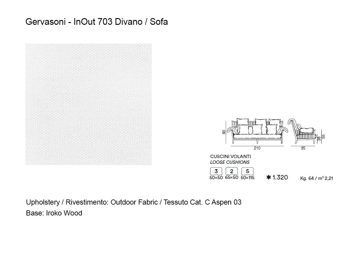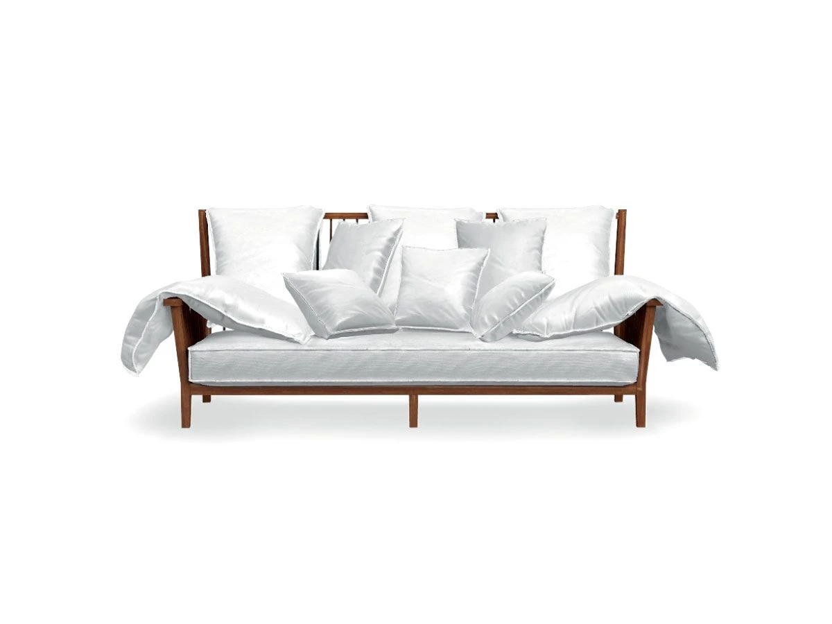 Inout 703 is a three seater sofa by Paola Navone for Gervasoni. Frame in oiled iroko for outdoor use. Loose cushions five 50×115, two 65×50 cm.