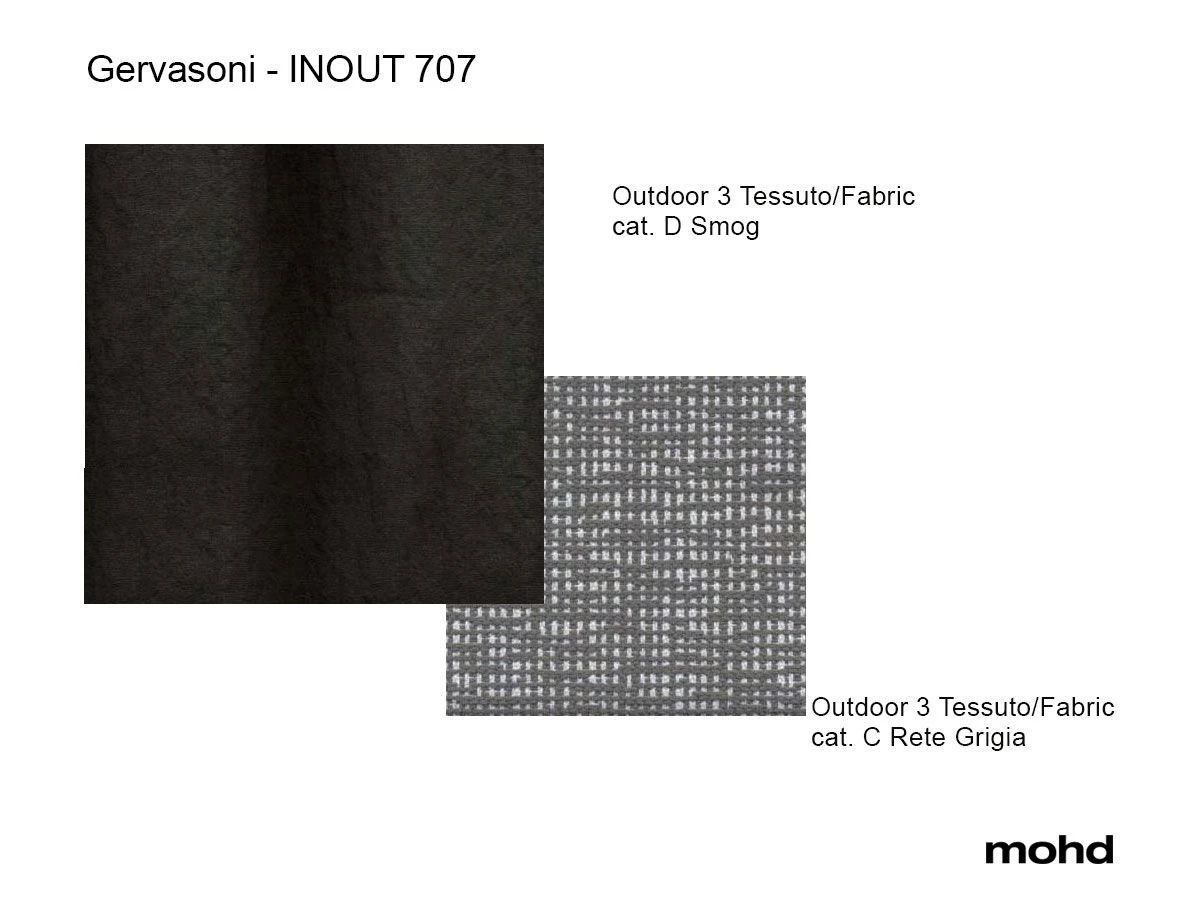 In this version seat cushion upholstered in fabric Outdoor 3 cat. D Smog; Cushion 50×65 cm upholstered in fabric Outdoor 3 cat. D Smog; Cushion 50×50 cm upholstered in fabric Outdoor 3 cat. C Rete Grigia.