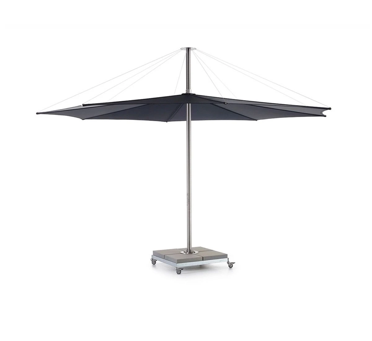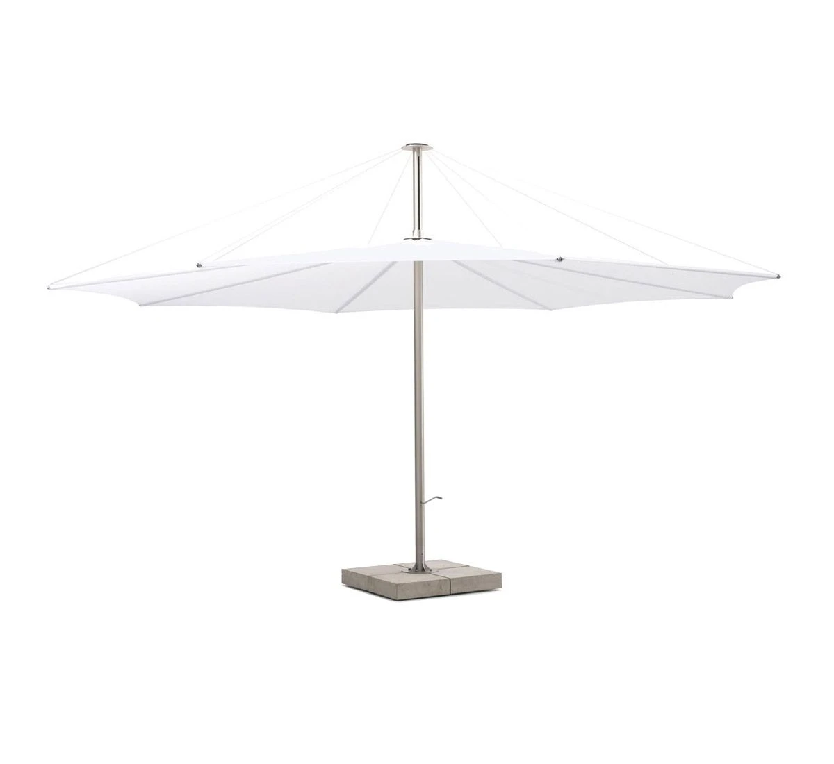 Inumbra is a unique umbrella for its essential and its aesthetics. The parasol opens and closes by means of a separate handle. All technical parts that open and close the screen are above the inumbra’s UV resistant fabric and consequently are not visible when seated under the parasol. Inumbra has been submitted to wind-tunnel testing at the Von Karman Institute. Although the parasol can withstand wind speeds up to 8 on the Beaufort scale, it is advisable to close it sooner (from wind speed 6 is the rule of thumb).