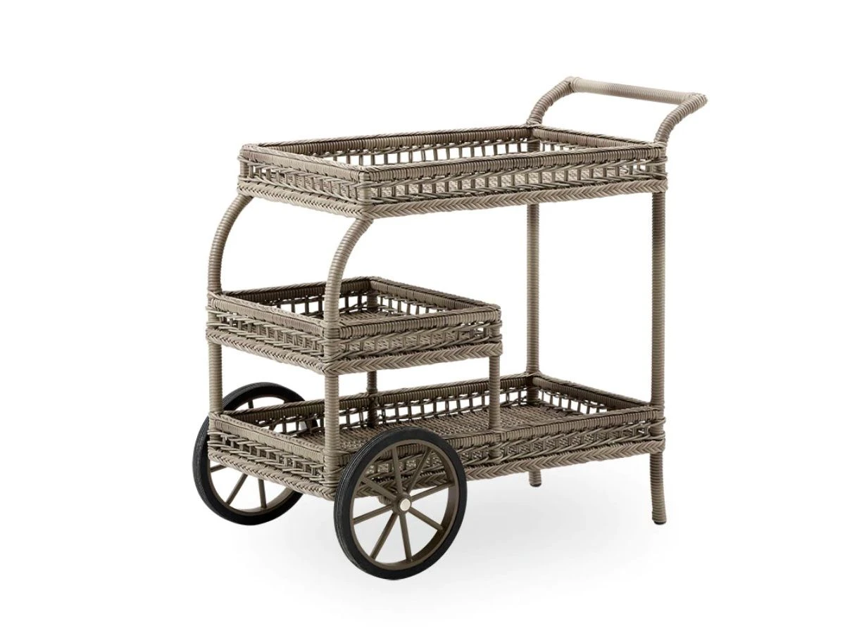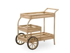 The James Trolley will win over all your guests with its retro, slightly ethnic look, ideal for serving cool drinks or as a display for flowering plants. The practical oversize castors allow you to move it easily to reach your friends. Three shelves and a practical bottle holder are attractively decorated in a natural colour scheme. James Trolley is solid and sturdy, with a handcrafted aluminium core covered with weaves that simulate rattan. The material used is called ArtFibre, flexible and resistant to external agents, it can be left outdoors all year round without needing any maintenance.