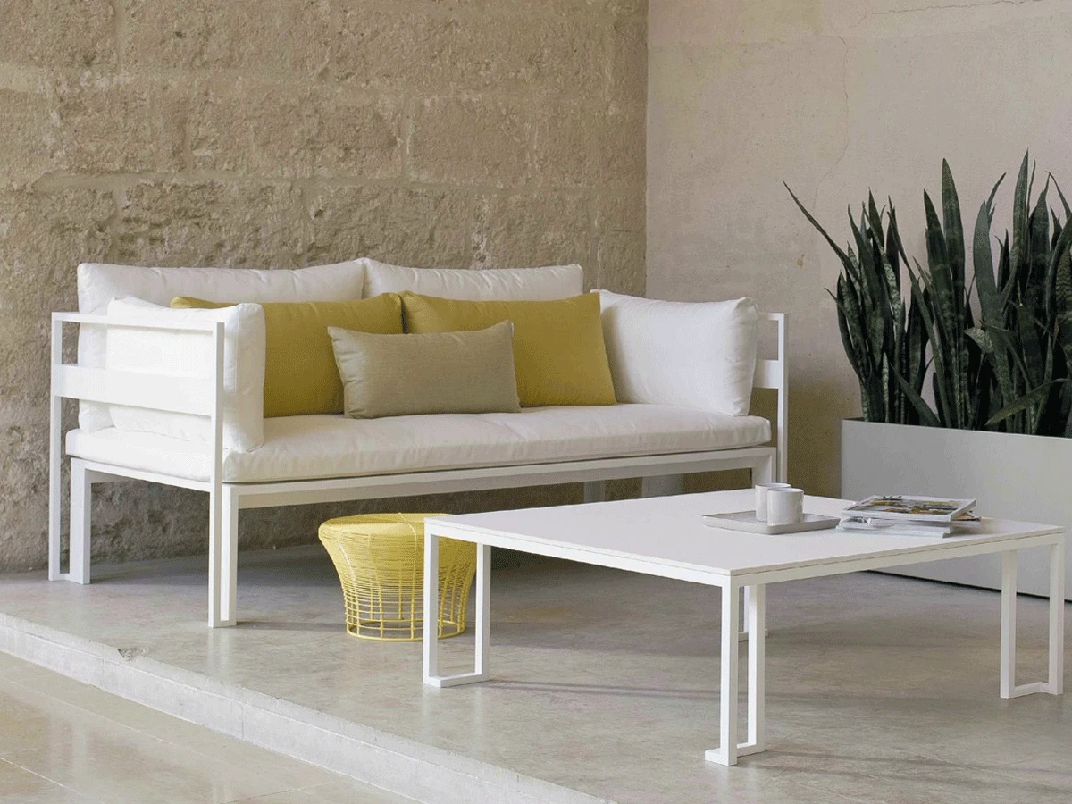 Jian is a sofa designed by Blacks & Hu for Gandia Blasco, the structure is made of aluminum and the cushions are in polyurethane foam rubber.