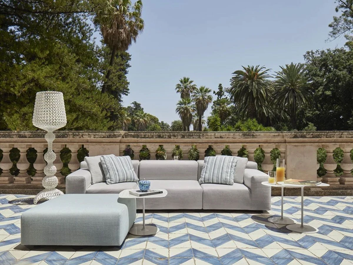 Plastics Outdoor is a collection of outdoor sofas designed by Piero Lissoni and produced by the brand Kartell. The series includes several modular elements to create infinite compositions. Plastics Outdoor is proposed in the 2-seater sofa, 2-seater with pouf and 3-seater sofa versions. Plastics Outdoor is upholstered in New Dyed Fiber fabric suitable for outdoor use.