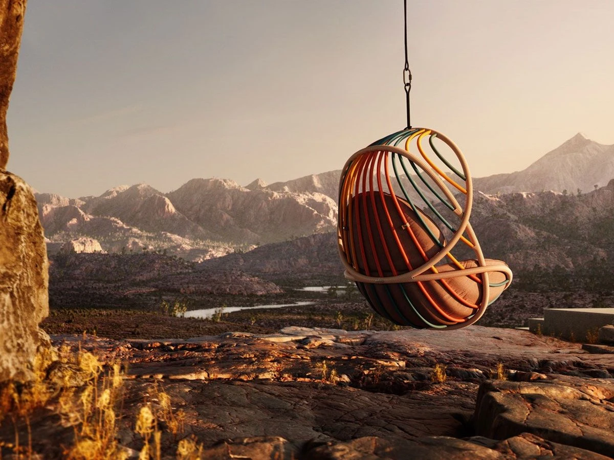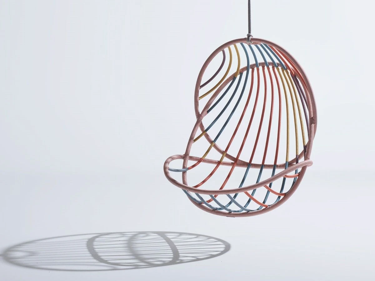 Kida is a hanging lounge chair that for the first time is wrapped rather than woven in 834 meters of Dedon special Fiber Touch. If you are looking for suggestive inspirations to furnish your living area under a starry sky, Kida is the armchair you are looking for, sinuous and welcoming like a suspended shell in which unusual finishes and colors are linked and blend together.Exotic suggestions, earthy nuances such as brown, pink, mustard, and terracotta up to the different shades that the sun can bring. From sunset to sunrise, Kida is a natural palette that infuses a warm and inviting atmosphere on the terrace or in the garden where it is located. Once seated inside, you will be able to enjoy the comfortable cushion that covers the entire seating area and feel soothed and relaxed while rocking.For maintenance of the frame, simply clean with a soft cloth and warm water.