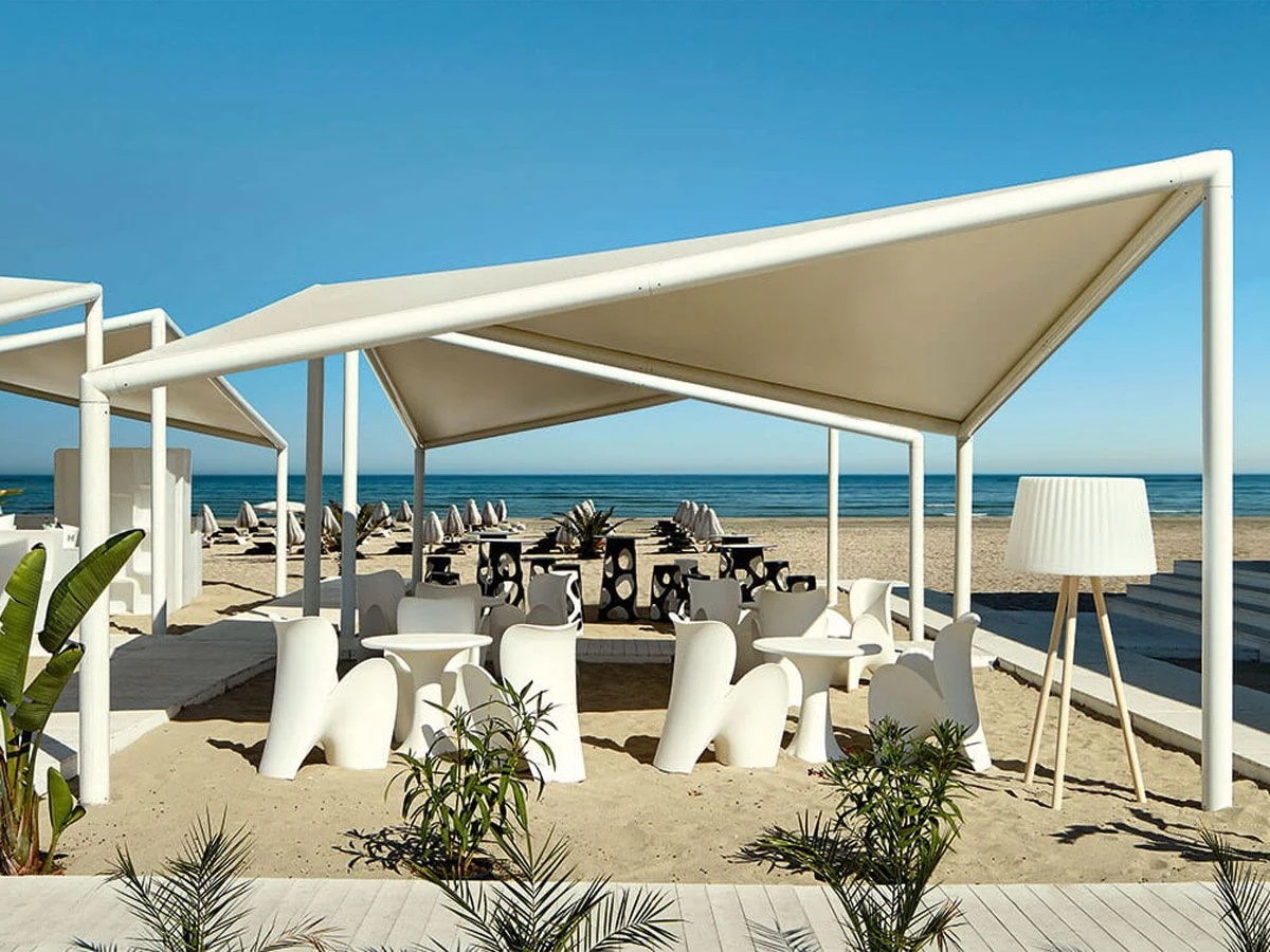 Designed by the brand Myyour in collaboration with the designer Simone Micheli, Kite is a gazebo made with an aluminum and steel frame entirely painted in white, with coated tent in nautical origin PVC.Kite is a gazebo by the modern design which is characterized by the particular geometric shape of the roof and for the construction materials chosen which also make it lightweight and thus easy to carry, just like a tent, it’s easy to assemble and disassemble. Equipped with LED lighting placed on the inner tent for a better light diffusion. It can be fixed to the ground with the provided plates, or ballasted with accessories containers filled with water. Perfect for outdoor restaurants or in your home’s garden.