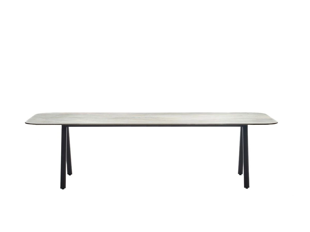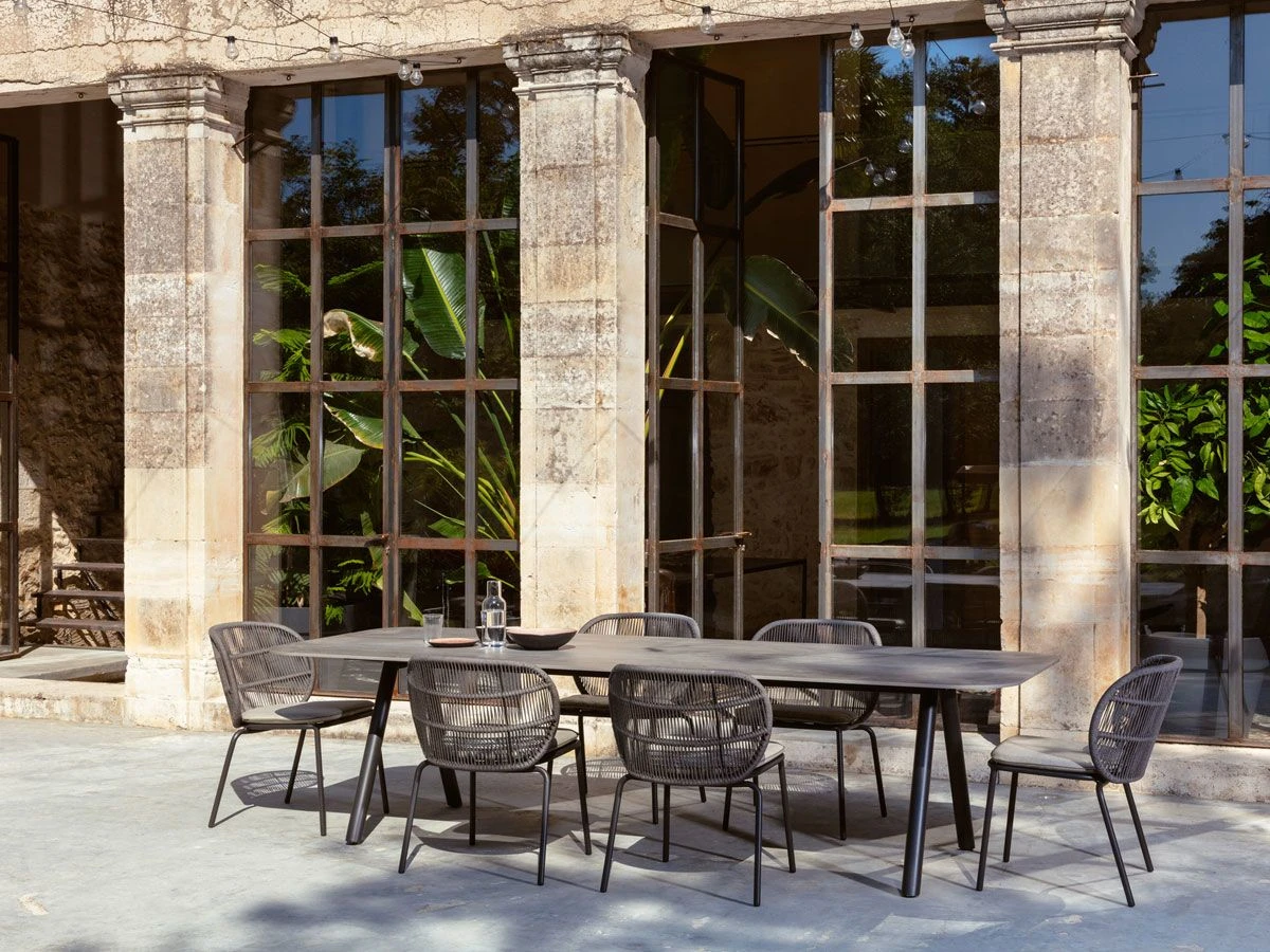 The Kodo outdoor dining table is designed by Studio Segers for the Vincent Sheppard brand. Made with ceramic top and powder-coated aluminum base. Adjustable nylon feet.