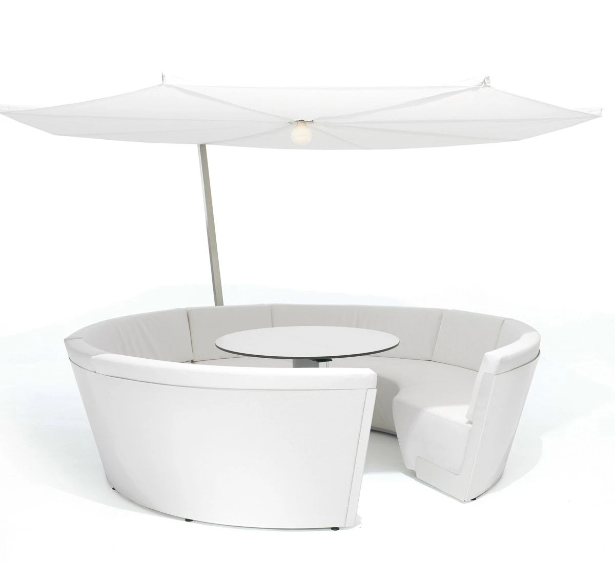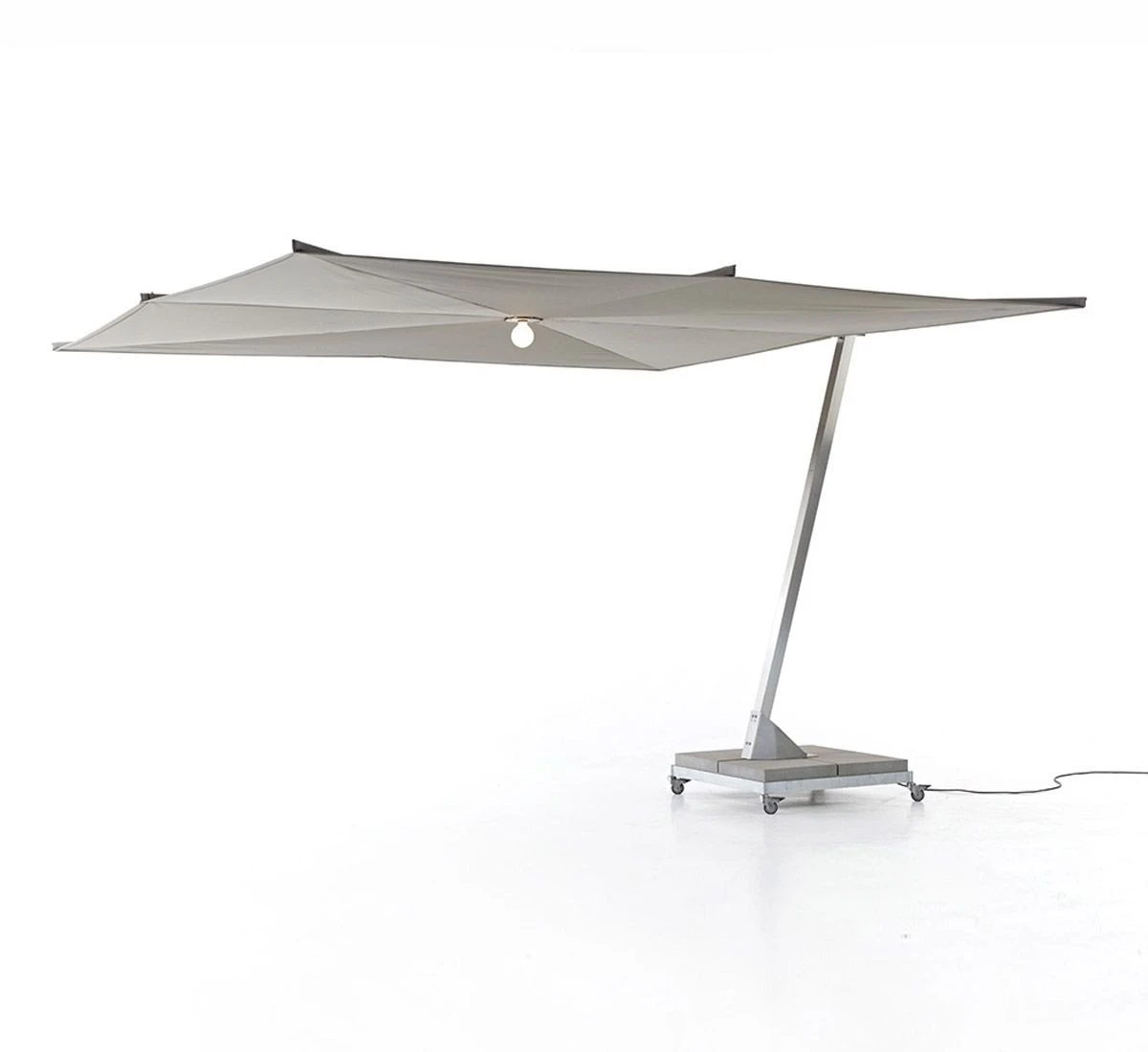Kosmos parasol is an ingenious design that opens horizontally like a fan, offering excellent wind resistance (wind force 6 on the Beaufort scale);All the materials used are of superior quality and extremely durable. Stainless steel guarantees a long lifespan; the high-tech polyester parasol fabric is very robust and UV resistant. Kosmos is available in square or round shape in three different colors and with LED lighting.