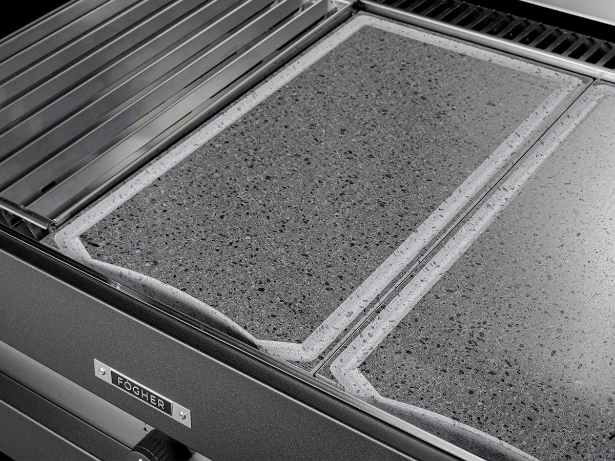 The FKC007 combination is the basic version of this practical and functional outdoor kitchen from the Fògher brand. Made of porcelain stoneware, it consists of a 3-burner barbecue ideal for both direct and indirect cooking. The multifunctional oven cover makes the barbecue a true professional object with which even the most complex recipes can be made. Adding further robustness to this elegant cooker are the frame and legs made of painted stainless steel, a material suitable for outdoor use due to its high resistance to corrosion and weathering. The 3 high-efficiency burners, which complete the gas hob, reduce consumption by 20-25% compared to traditional models. Positioned in a garden, Làres Gres is the ideal kitchen for pleasant moments of conviviality outdoors.