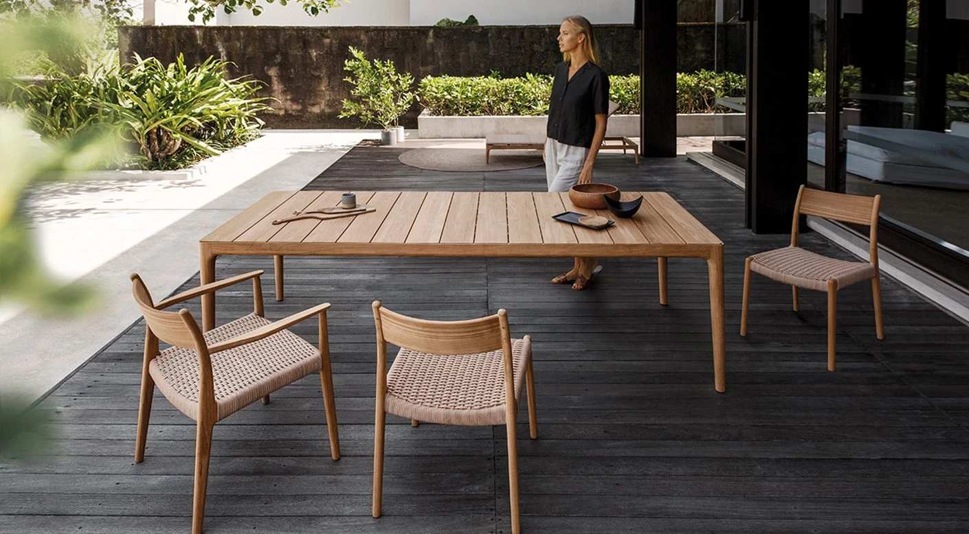 Lima chair designed by Henrik Pedersen for Gloster. Collection of products made with structure in teak and wicker woven grain color. Versatile and elegant chair resistant to weathering.
