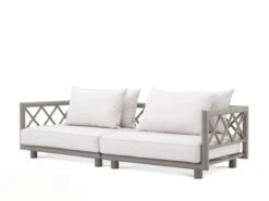 The Mandelieu Sofa takes its name and its style from the small French town in Provence.The criss-cross pattern that decorates the continuous band, armrests and backrest, gives a Provencal country chic accent to a simple and essential structure. At the base of this product there is the quality of the materials that will guarantee a long duration in time. The round section frame is made of powder-coated aluminium. The very soft padding is covered with Sunbrella canvas, a technical fabric used for sailing boats. This fibre is highly weather-resistant, easily washable and transpirant.