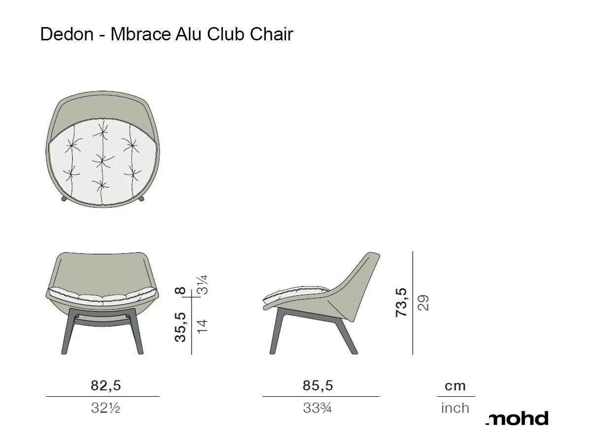 Mbrace Alu is an outdoor seating collection designed by Sebastian Herkner for Dedon. The series includes the lounge and club armchair, Wing armchair, footstool and armchair, with an aluminium base, fibre shell, and cushions upholstered in fabrics suitable for outdoor use.