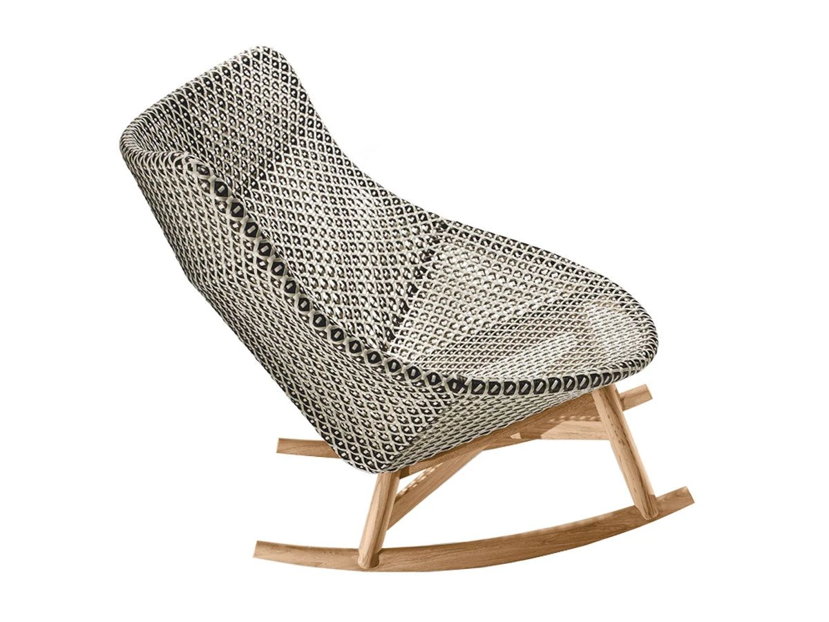Designed by Sebastian Herkner for Dedon, Mbrace is an outdoor rocking chair with a wicker frame and seat/backrest cushion fabric covered.