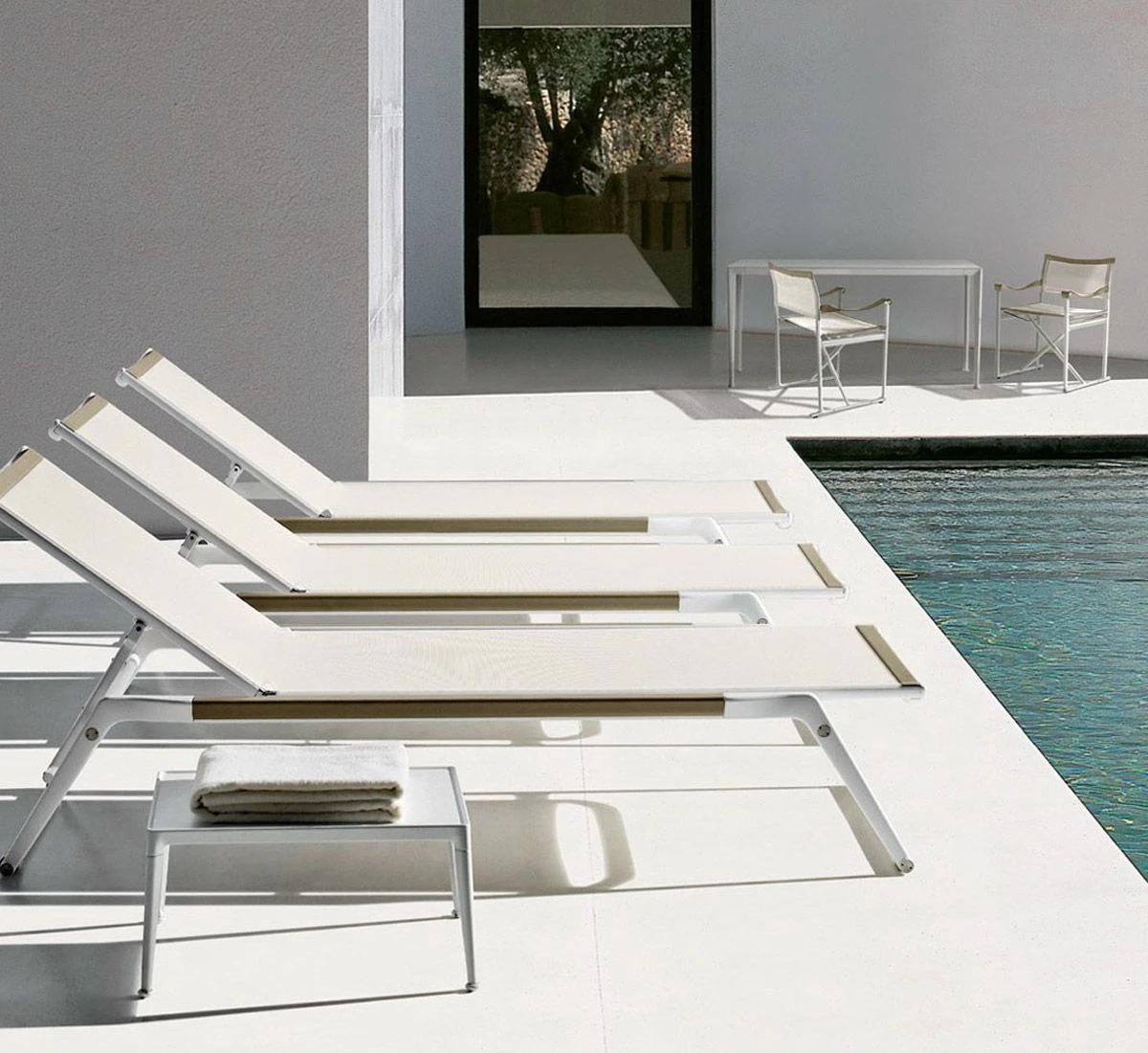 Mirto is a coffee table is part of a rich collection of outdoor furniture along with a chair, an armchair with armrests, a folding armchair, dining tables and a chaise longue. The mesh and metal parts are finished in two colors, white and tortora (dove-grey). Mirto won’t disappoint the expectations of those who have an eye for detail and want a stylish outdoor space.