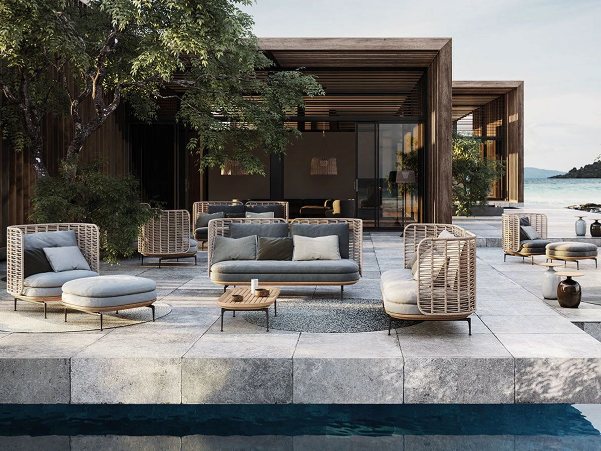 Sober and essential style, but without renouncing the refinement signed Gloster; Mistral is the perfect collection to furnish your outdoor space just like a living room, with the same care and quality of the materials. A perfect balance of sophisticated details, with its symmetrical curves and a palette of natural and neutral colors. The Mistral collection is perfect for any environment, from a large veranda to a garden, or to complete the poolside of an elegant Resort.