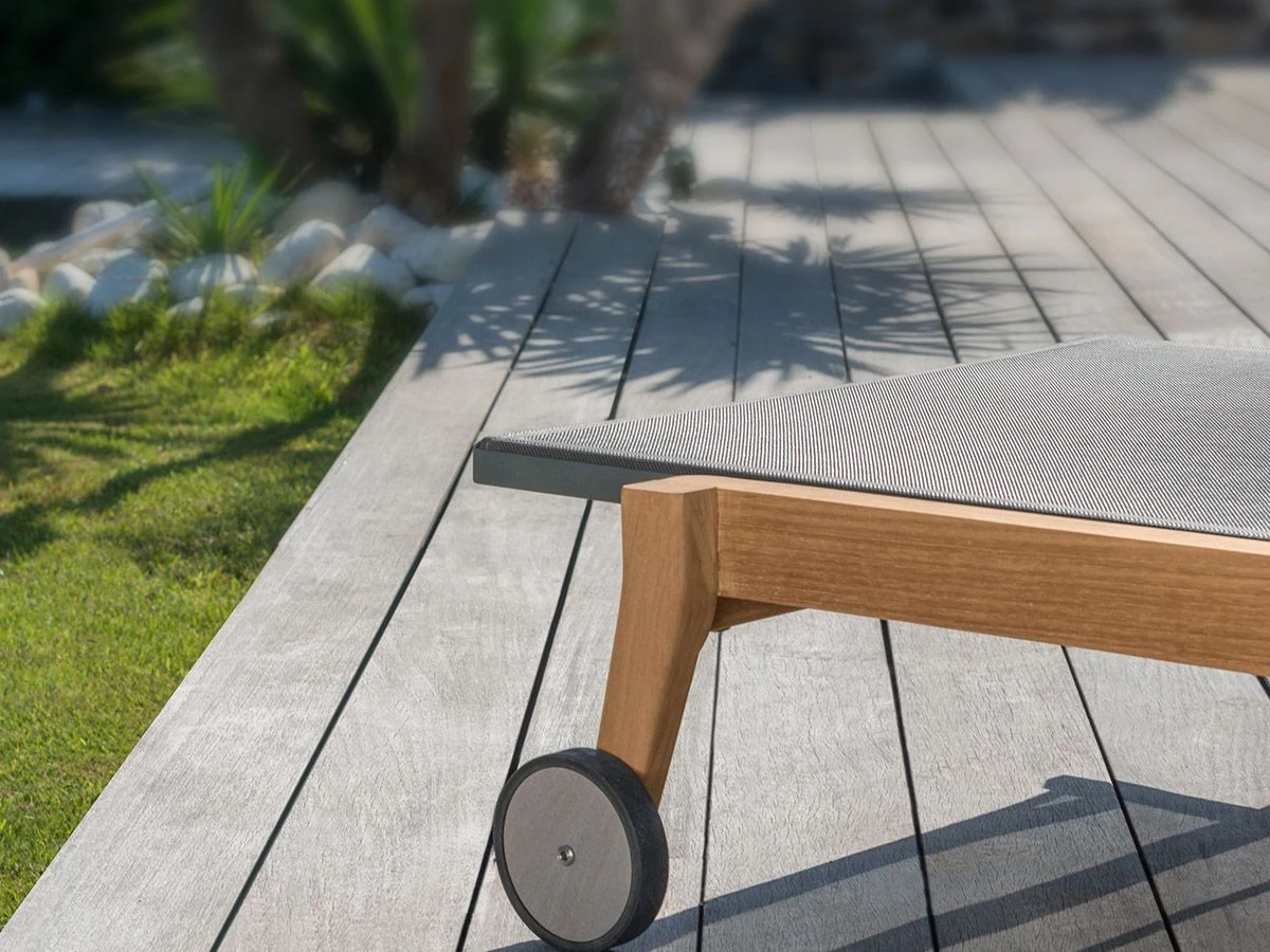 The Moon sunbed is part of the new outdoor collection designed by Cristian Visentin for Talenti. All the items of the collection have a natural teak frame. Moon sunbed has black textilene seat, stainless steel wheels and racks, and it is stackable.