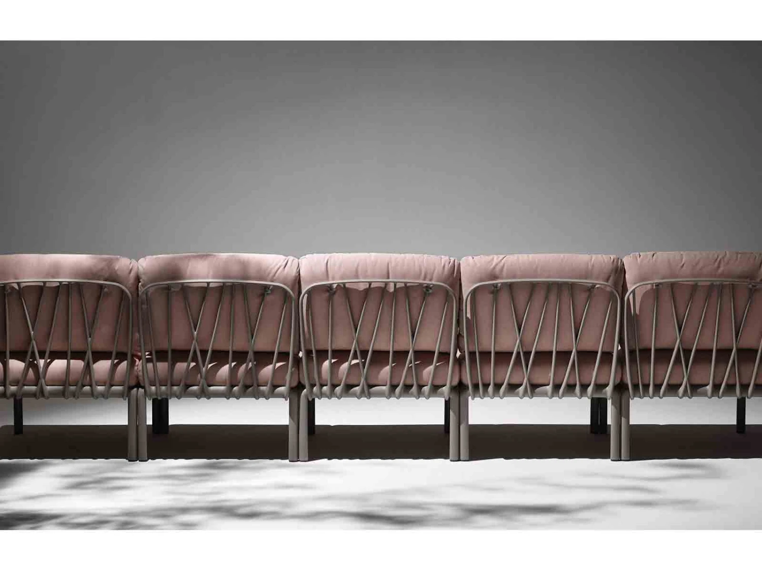 Inspired by tree branches, Komodo 5 is a modular outdoor seating system with fiberglass structure and soft padding that offers exceptional compositional freedom and can be designed taking into account space, taste and individual needs. The backrest and armrests can be mounted on all sides of the seat, and are completely removable and available in different opaque color combinations. Supplied with non-slip feet. Complete set of 5 seat cushions included.