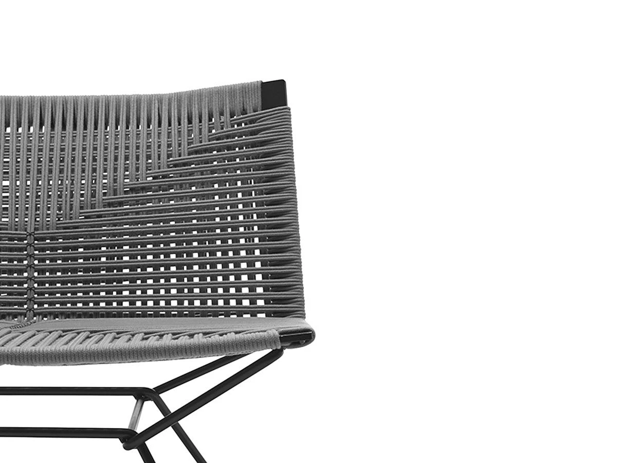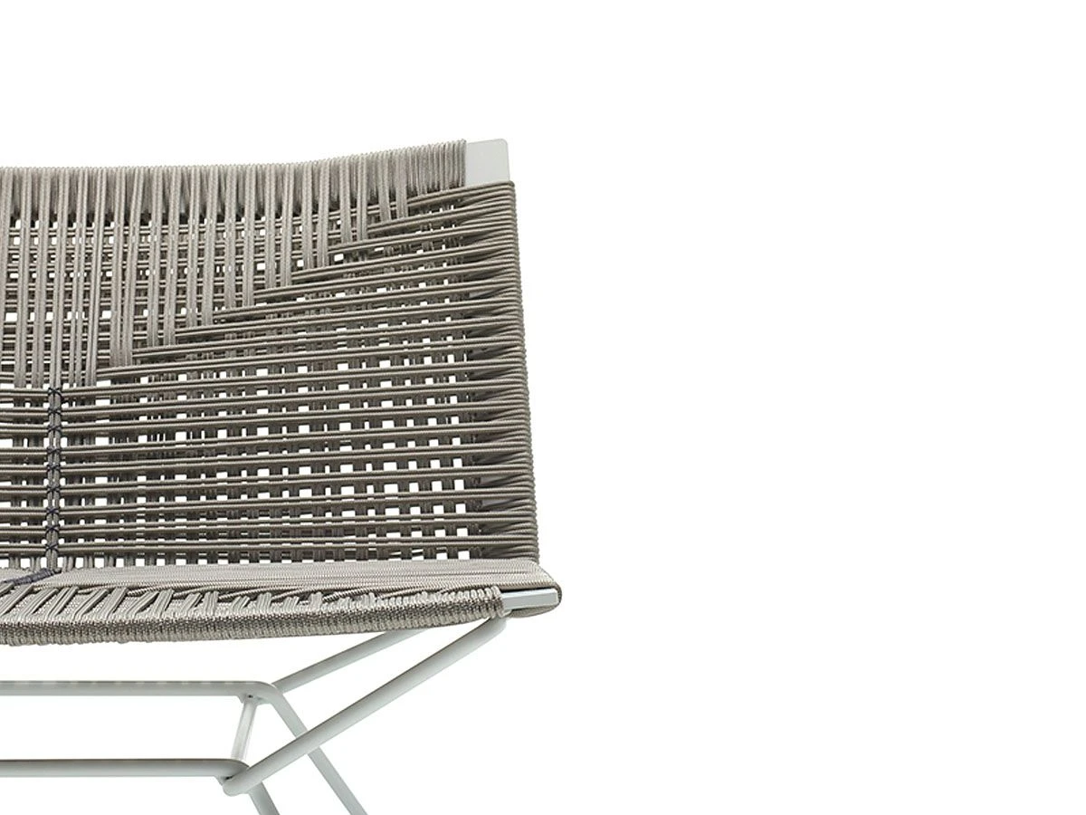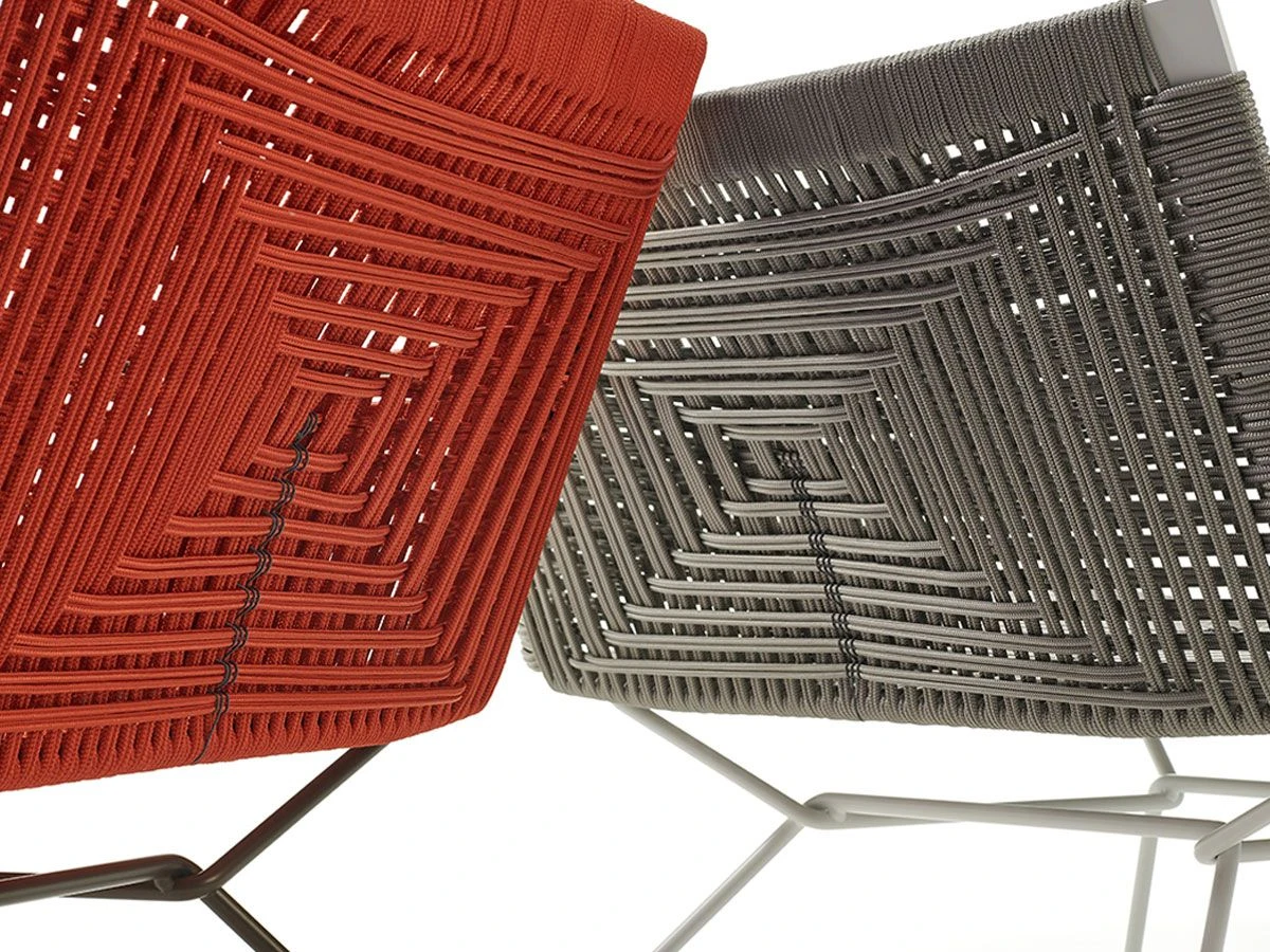 The Neil seating collection expands with this armchair made with a braided polyester rope by hand and by the detail of a crossing point internally in contrast with the geometric back, which gives it a touch of exclusivity. Backrest and seat supporting structure made of steel with sled base. Available in the low variant, with or without armrest. All Neil Twists feature a detail with contrast stitching thread, for all variants, in Glossy Anthracite color.