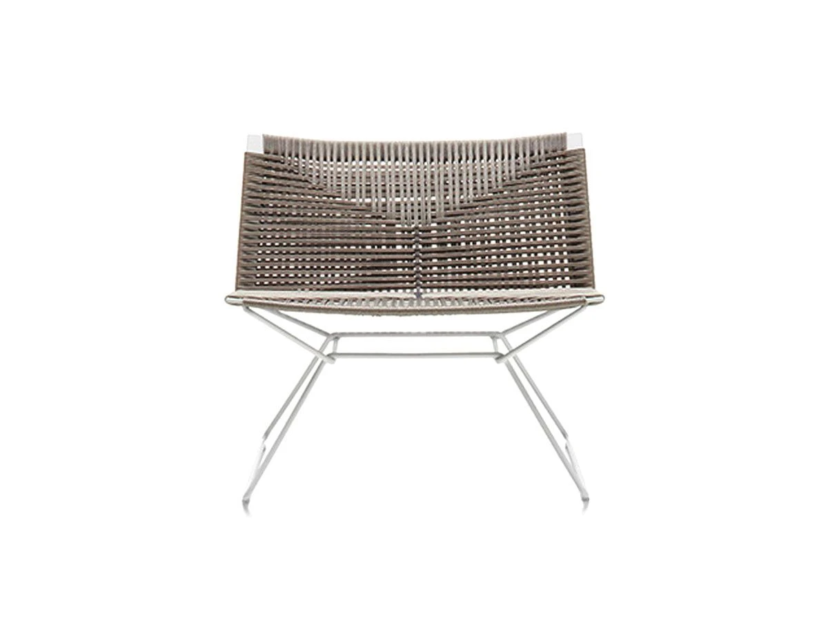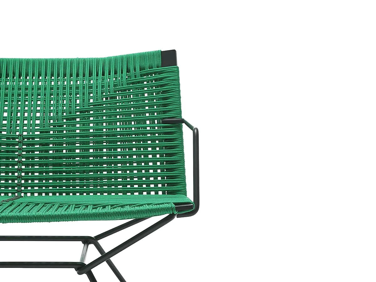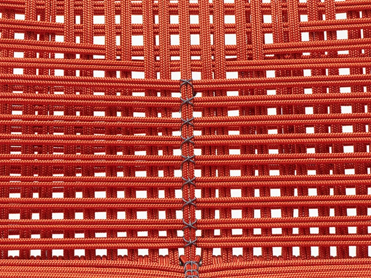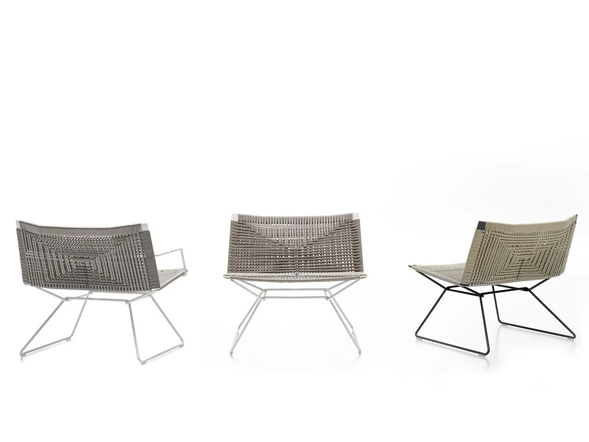The Neil seating collection expands with this armchair made with a braided polyester rope by hand and by the detail of a crossing point internally in contrast with the geometric back, which gives it a touch of exclusivity. Backrest and seat supporting structure made of steel with sled base. Available in the low variant, with or without armrest. All Neil Twists feature a detail with contrast stitching thread, for all variants, in Glossy Anthracite color.