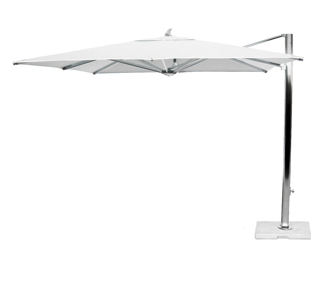In this version square 305 cm – 8 slats Cod. UOMMCV02A5020 Size L. 305 cm – P. 305 cm – H. 259 cm – Fabric Natural 4604 – Base aluminum cube half Aluma–crete 250 kg 114x66cm white color Cod. USACAL05A02 – Cover max cantilever color gray.