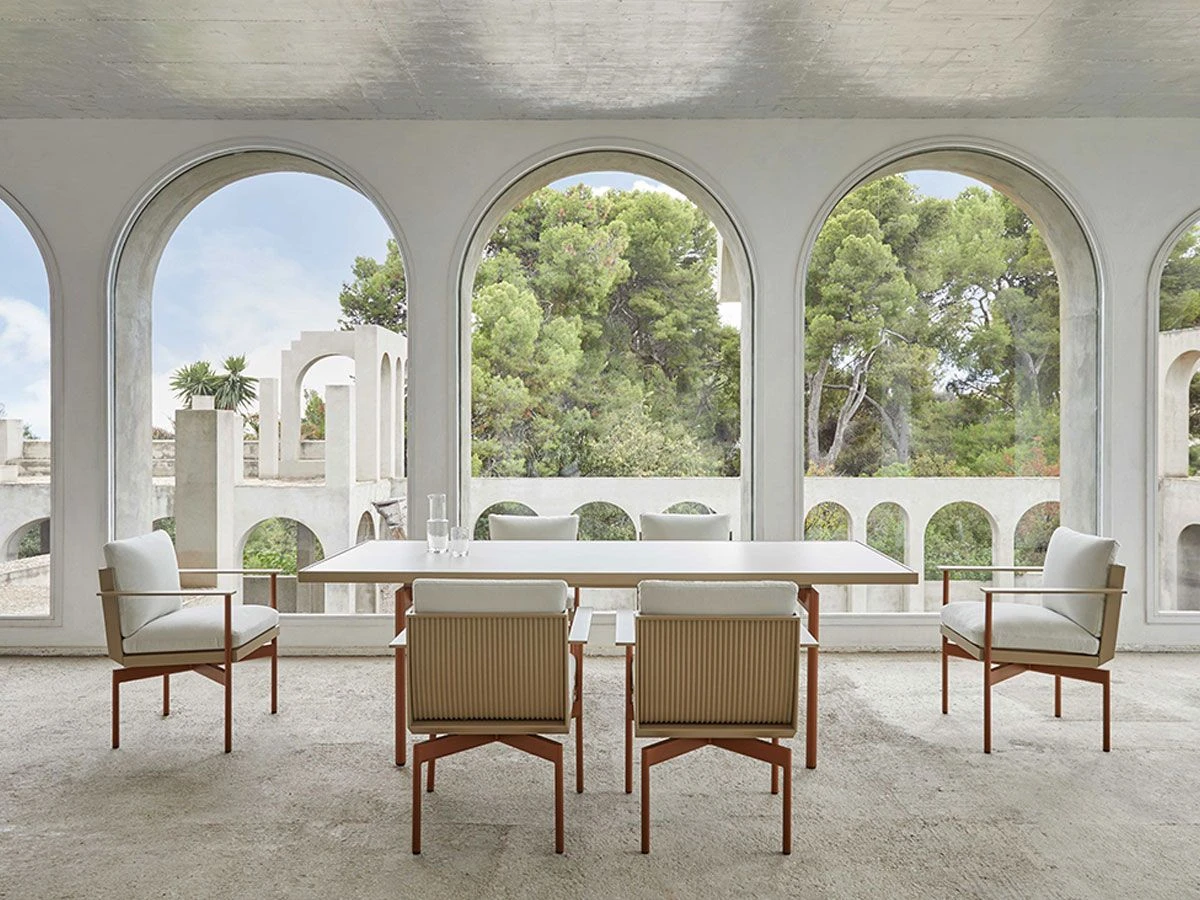 Onde is an elegant collection of outdoor furniture designed by Luca Nichetto for GandiaBlasco. The series consists of a lounge armchair, 2 and 3 seater sofa, dining table and chair. Available in different finishes.